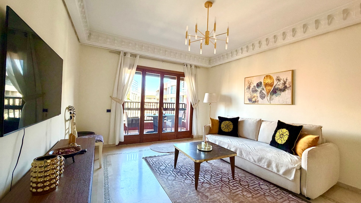 ✅ 24/7 Check-in | 📍 City Center | 🌅 Pool-View Terrace | 💦 4 Swimming Pools Relax in this spacious and bright 2-bedroom apartment with a private terrace overlooking the pool, ideally located in the heart of Marrakech. ✔ Private terrace with pool view ✔ Access to 4 swimming pools within the residence ✔ Air conditioning in all rooms ✔ Free on-site parking ✔ High-speed Wi-Fi ✔ 70-inch home cinema TV with IPTV ✔ Dedicated office area with monitor screen (ideal for remote work)