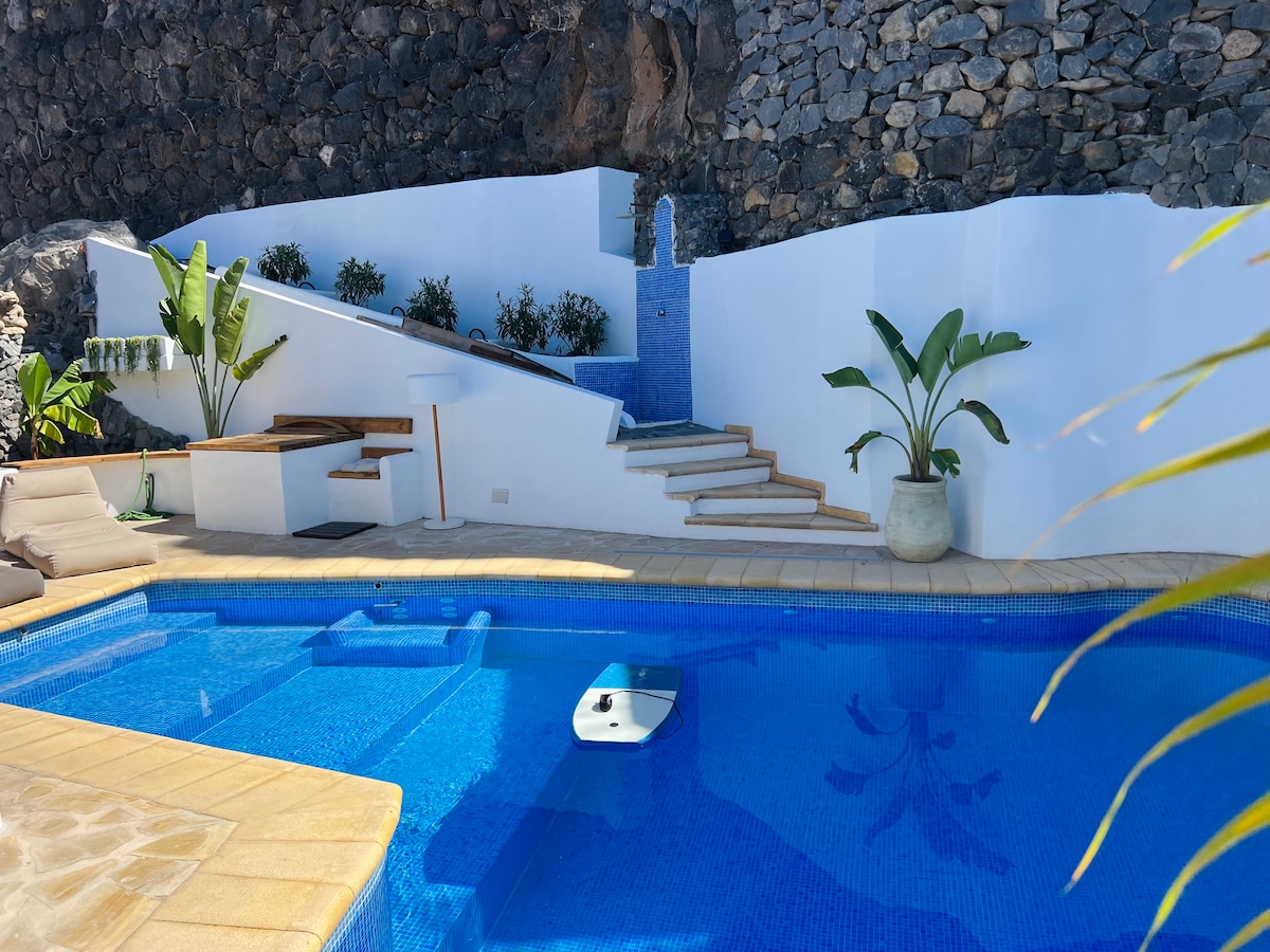 Tropischer ruhiger Garten in der Nähe des Meeres, Glasfaser-WLAN: Hier ist es möglich, die Stille, die Aussicht auf das Meer und einen Garten voller Stil und Faszination zu genießen. Die wahrscheinlich gemütlichste Ecke ist der elegante Swimmingpool und die Außenlounge, die dazu einladen, die sonnigen Winternachmittage und die Sonnenuntergänge während des restlichen Jahres zu genießen. Toller Poolbereich. Die Finca liegt ganz in der Nähe des berühmten Playa del Socorro: entspannte Atmosphäre durch die schönen Sonnenuntergänge und die Surfer-Wettbewerbe