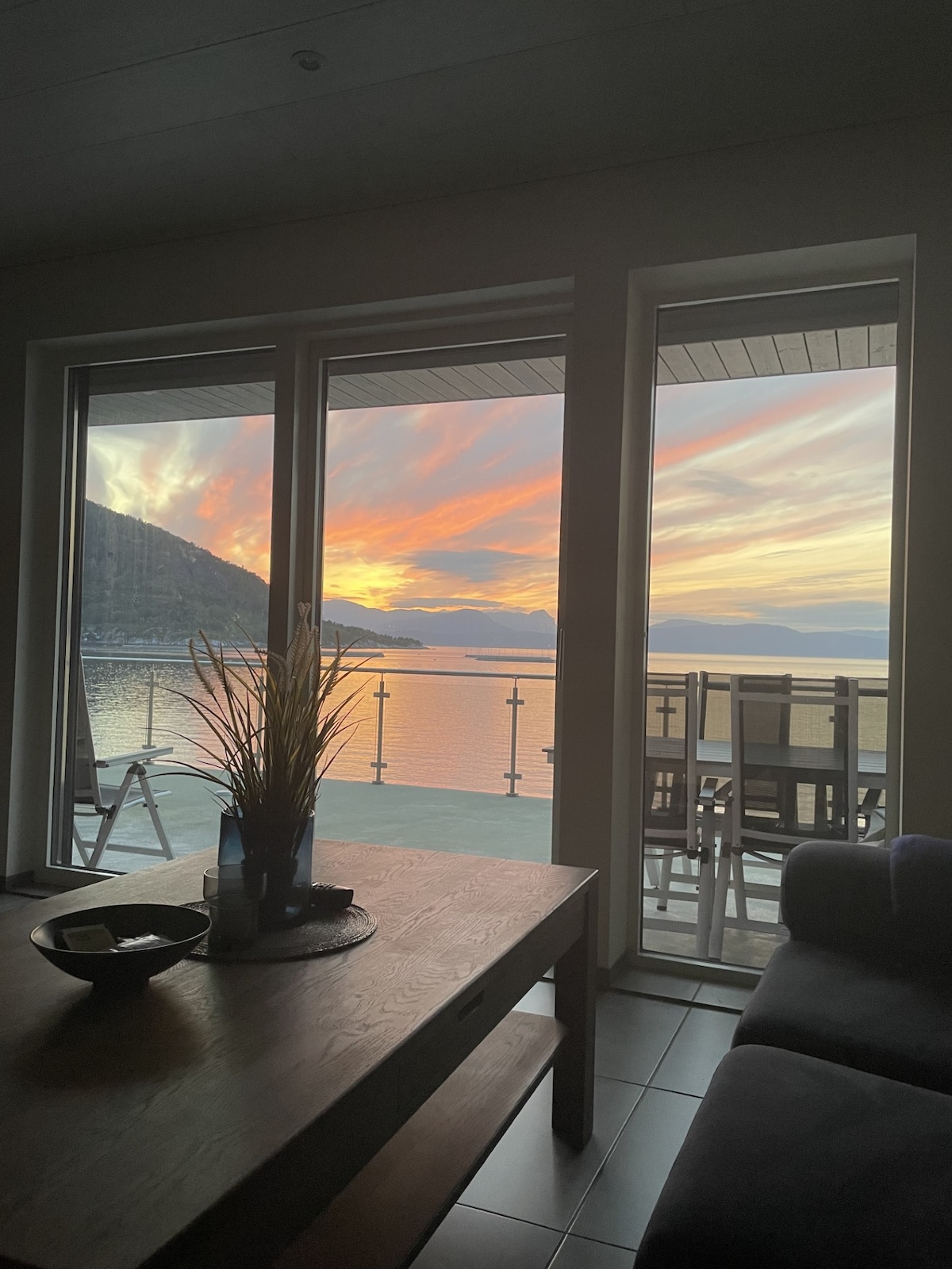 Tolle Hütte für 40 Meter vom Rande des Meeres entfernt. Fjordblick und Eiga-Strand. Dies ist eine neue Hütte mit großer Terrasse, Südlage, guten Sonnenbedingungen und geschmackvoller Einrichtung. Es gibt zwei Wohnzimmer im 1. Stock und zwei Zimmer im 2. Stock. Die Treppen zum Loft sind steil und es gibt niedrige Decken im 2. Stock. Heizkabel im Wohnzimmer, Flur, Küche und Badezimmer. Kurzer Weg zum Bootsplatz und zur Anlegestelle. Du kannst ein SUP, Kajak oder Fisch an der Bar mieten. Auf Wunsch brennen wir auch neu gebaute Sauna an.