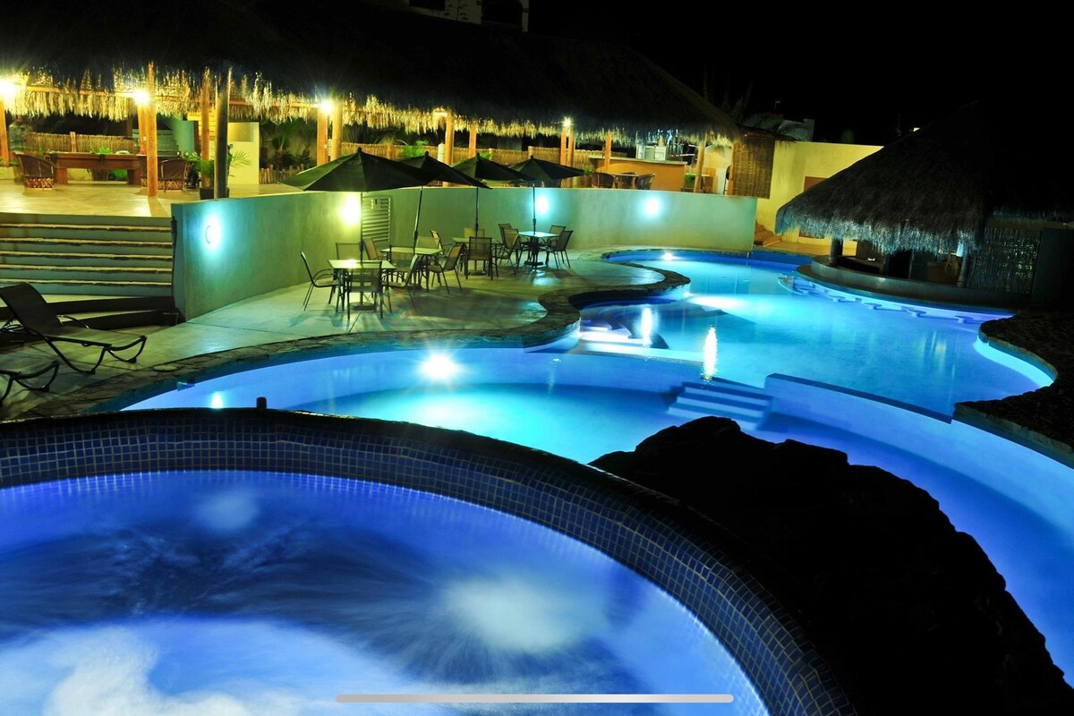 Déjate consentir en este renovado alojamiento. Tenemos todo lo necesario para una estancia placentera: cama extra cómoda, asador, terraza, jardín y una pequeña alberca tipo plunge pool totalmente privada para ti y tu pareja. Y si quieres explorar, estamos a pocos metros de la playa, a 5 min. en carro del malecón, y rodeado de plazas comerciales, restaurantes y tiendas de conveniencia.