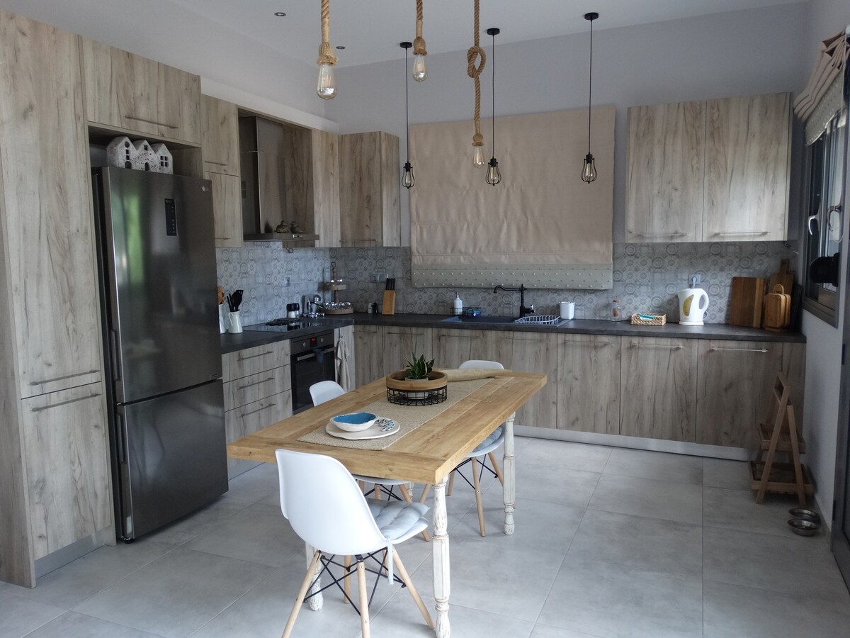 The house was built in 1988 on the edge of an orange orchard. It is 185 sq m. and consists of 3 levels. The 1st level consists of a bedroom, dining room, kitchen, and a WC with a shower. The living room occupies the second level with a fireplace and a wardrobe. On the third level are 2 bedrooms, a bathroom, and an office with two beds. It is suitable for holidays. It is a 4-minute drive from the beach or a 15-20 minute walk. It can accommodate up to 10 people. It has α private pool, no heated