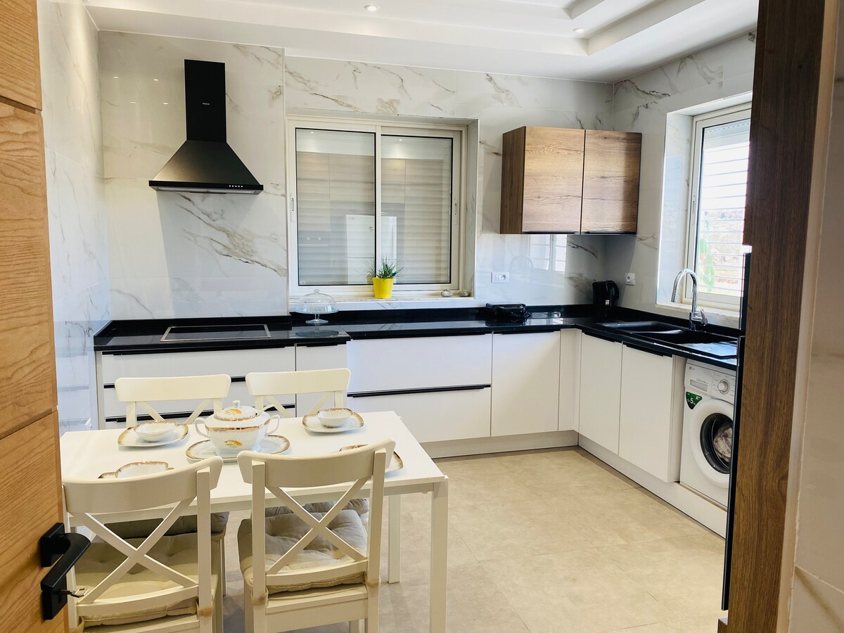 High-end design apartment of 120 m² (70 m² interior and 50 m² terrace), fully equipped and ideally located in a quiet neighborhood of Monastir. The terrace, furnished with garden furniture, a parasol, and exotic plants, is perfect for relaxation. This spacious, modern, and bright apartment is ideal for comfortable stays, whether as a couple or with friends. Close to amenities and beaches, it provides a unique setting to explore Monastir.