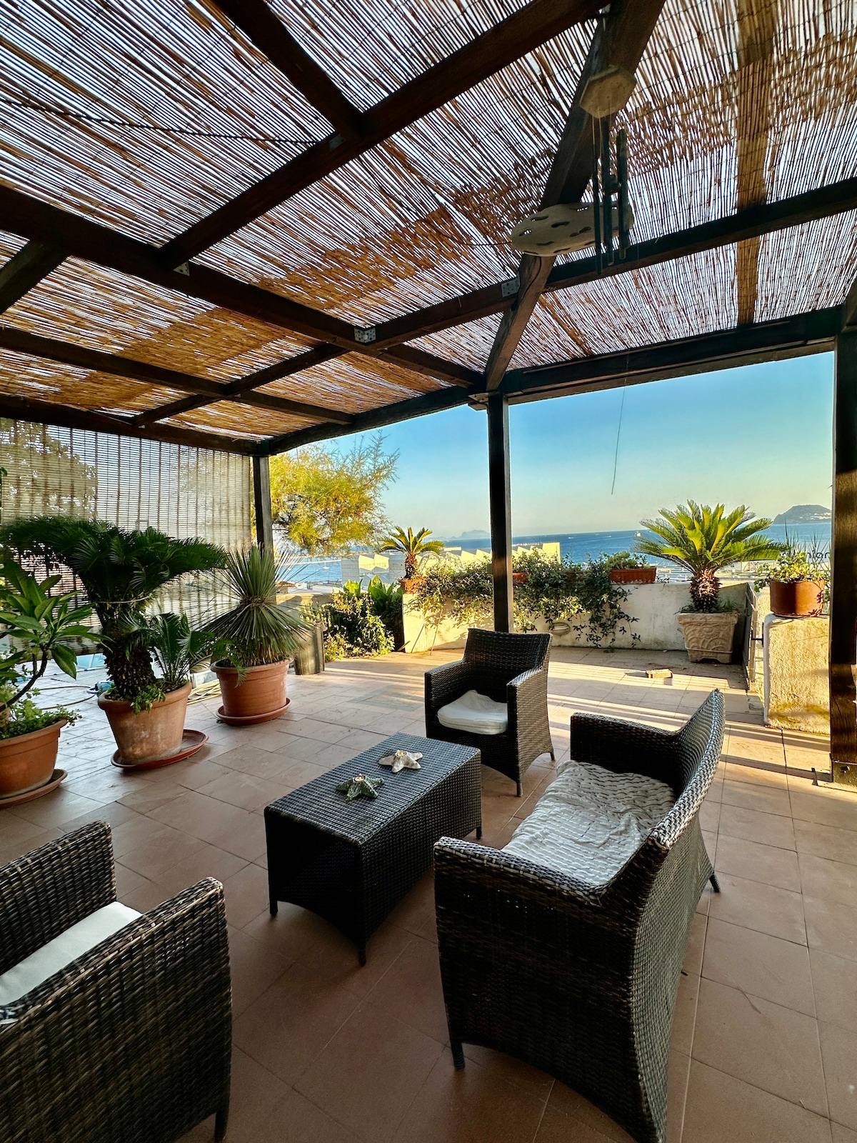 Die Wohnung befindet sich auf Punta Epitaffio, 500 Meter vom Hafen des Golfs von Baia, vom Archäologischen Park und in der gleichen Entfernung von den Bade- und Thermalbädern in der Nähe des Unterwasserparks von Baia entfernt. Sie umfasst Küche/Wohnzimmer, ein Schlafzimmer mit Doppelbett, ein weiteres Nebenraum mit Einzelbett, zwei Badezimmer, einen großen Außenbereich mit Außenküche, überdacht und mit Panoramablick, sowie eine große Terrasse mit Blick auf das Castello Aragonese von Baia.