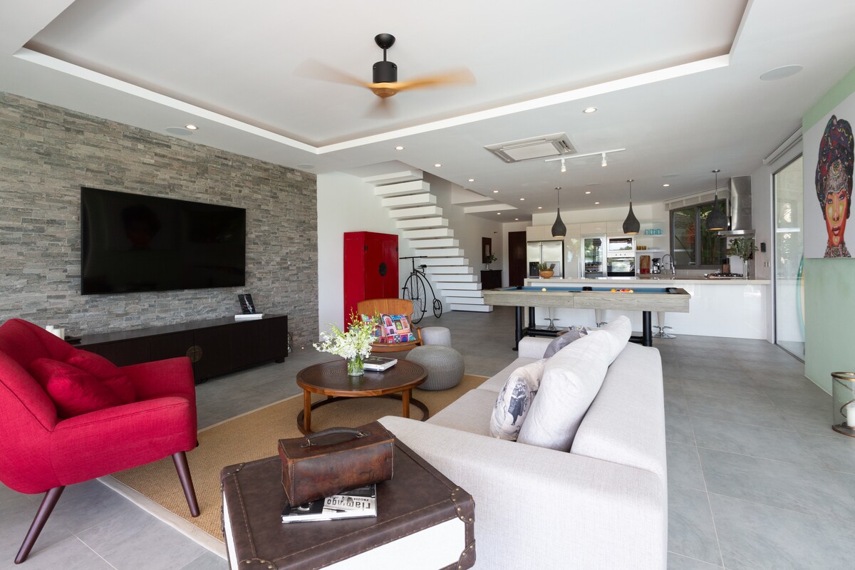 LoVa ist eine Villa mit 3 Schlafzimmern auf den Höhen von Chaweng, im prestigeträchtigen Viertel Chaweng Noi mit einem außergewöhnlichen Blick auf die Bucht. Nur 5 Minuten mit dem Roller oder Auto vom Zentrum von Chaweng und seinen herrlichen weißen Sandstränden entfernt . Diese herrliche Villa bietet dir 3 schöne Schlafzimmer, zwei mit Kingsize-Betten und eine weitere mit zwei Einzelbetten. Eine moderne und raffinierte Dekoration, eine voll ausgestattete Küche und 3 Badezimmer, die jeweils an ihr Schlafzimmer angrenzen. Die Residenz verfügt über einen rund um die Uhr geöffneten Fitnessraum.