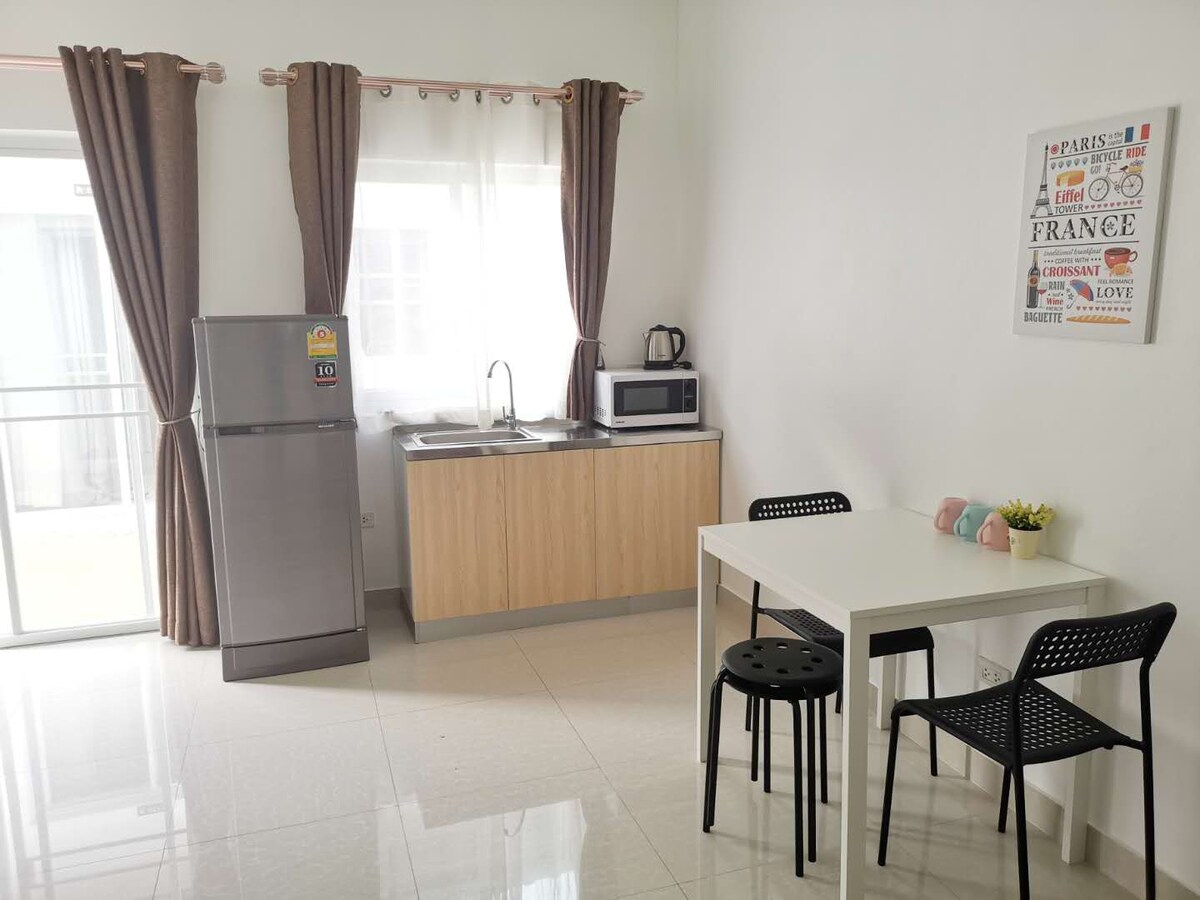 Entspanne dich zusammen in dieser ruhigen Unterkunft. Modernes Haus mit 2 Schlafzimmern und Gartenblick. In der Nähe des Meeres, nur 5-10 Gehminuten vom Strand entfernt. Ein Lebensmittelgeschäft ist nur 15 Gehminuten entfernt. 20 Minuten vom Frischmarkt, Lotus Express und Big C Mini. Am Abend können Sie entlang der Hauptstraße spazieren, die auf beiden Seiten voller Streetfood ist. Hinweis: Eine Kaution (Kaution für Schäden an der Unterkunft) wird im Voraus in Höhe von 5.000 Baht/Monat, 3.000 Baht für Kurzzeitaufenthalte erhoben. Wasser und Strom werden separat bezahlt, nicht im Mietpreis enthalten. Stromeinheiten/8 Baht Wasser 45 Baht/Einheit Der Gaspreis beträgt 550 Baht, ich möchte kochen.