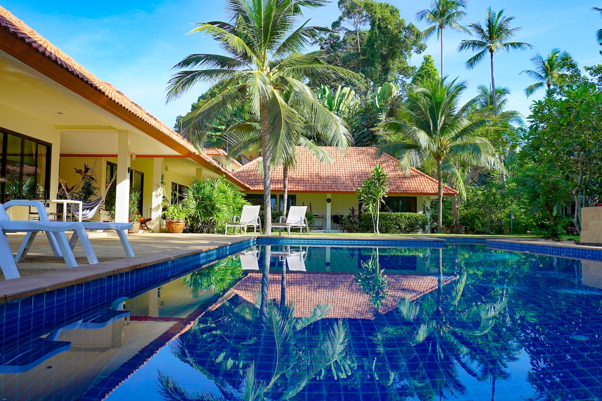 Ein einzelnes Haus für ein Paar oder eine kleine Familie mit persönlichem Bereich. Von einem hohen Boden aus hast du einen schönen Blick auf einen Hang am Strand. Das Haus ist gut ausgestattet mit vielen Aktivitäten, die du unternehmen kannst. Von der Entspannung auf den Bänken und einer Schaukel in einem Strandhof, einem Abendessen mit Grillparty, zum Schwimmen, Kajakfahren oder du kannst Fische/Garnelen/Krabben fangen, wenn du möchtest (wir haben Löffelnetz und Stirnlampe). Wenn du auf der Suche nach einem Ort bist, an dem du wie deinen eigenen genießen kannst, wirst du hier begeistert sein.