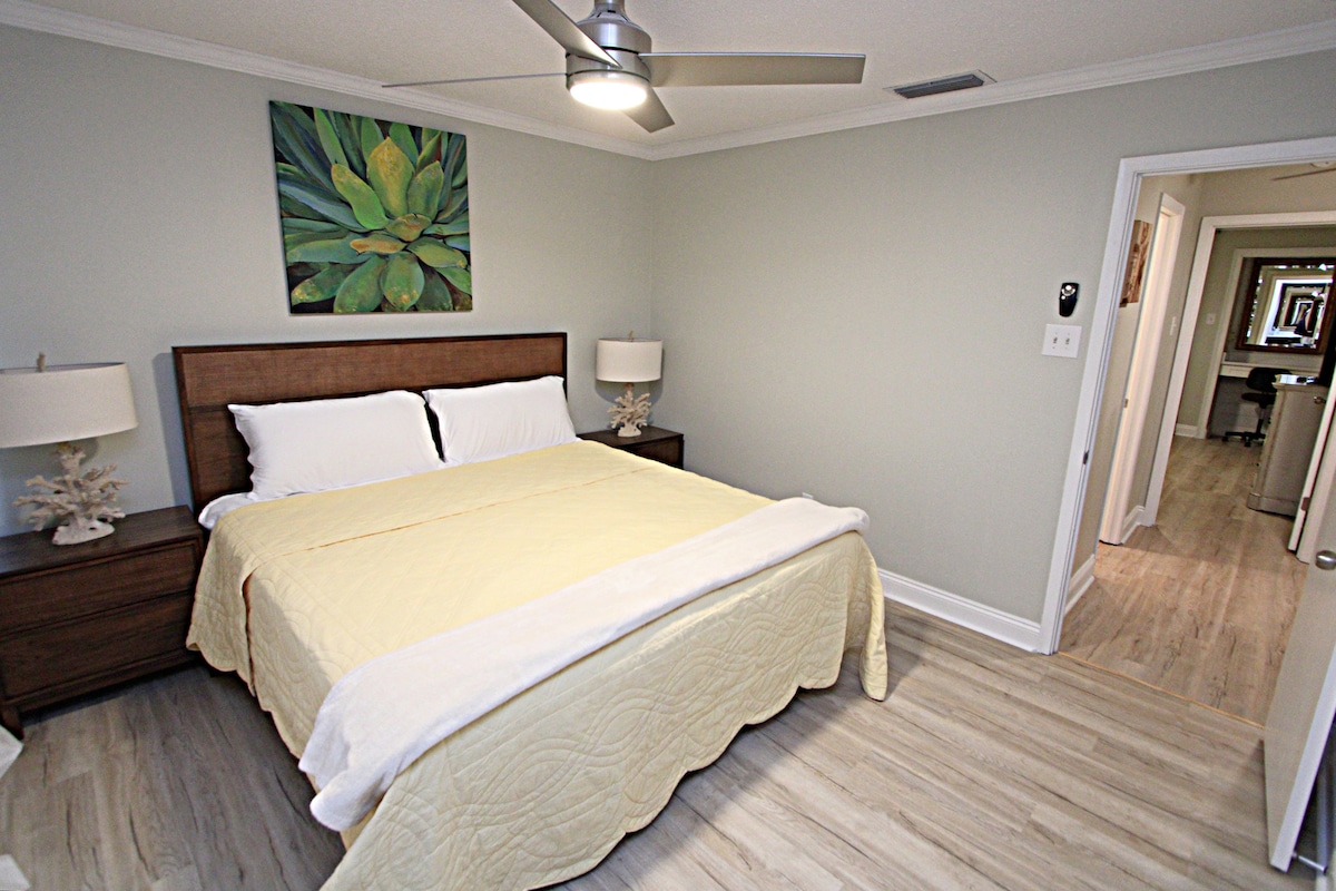 Zentral gelegen. Diese Einheit IM ERSTEN STOCK befindet sich an der Ecke des Gebäudes. Der einzige gemeinsame Nachbar ist der über dir. Wir sind 1,7 Meilen vom Strand entfernt. Schlafmöglichkeiten für bis zu 6 Personen, aber nur 4 ERWACHSENE mit 2 Kingsize-Betten und einem Ausziehbett. Die Schlafzimmer verfügen über verbundene Badezimmer. 58-Zoll-Roku-Fernseher im Wohnzimmer und 40-Zoll-Roku-Fernseher in jedem Schlafzimmer. Gut ausgestattete Küche mit fast allem, was du für deine Bequemlichkeit benötigst. Shampoo und Seife sind Starterpakete. Wir erlauben nicht, die Sofas als Betten zu verwenden.