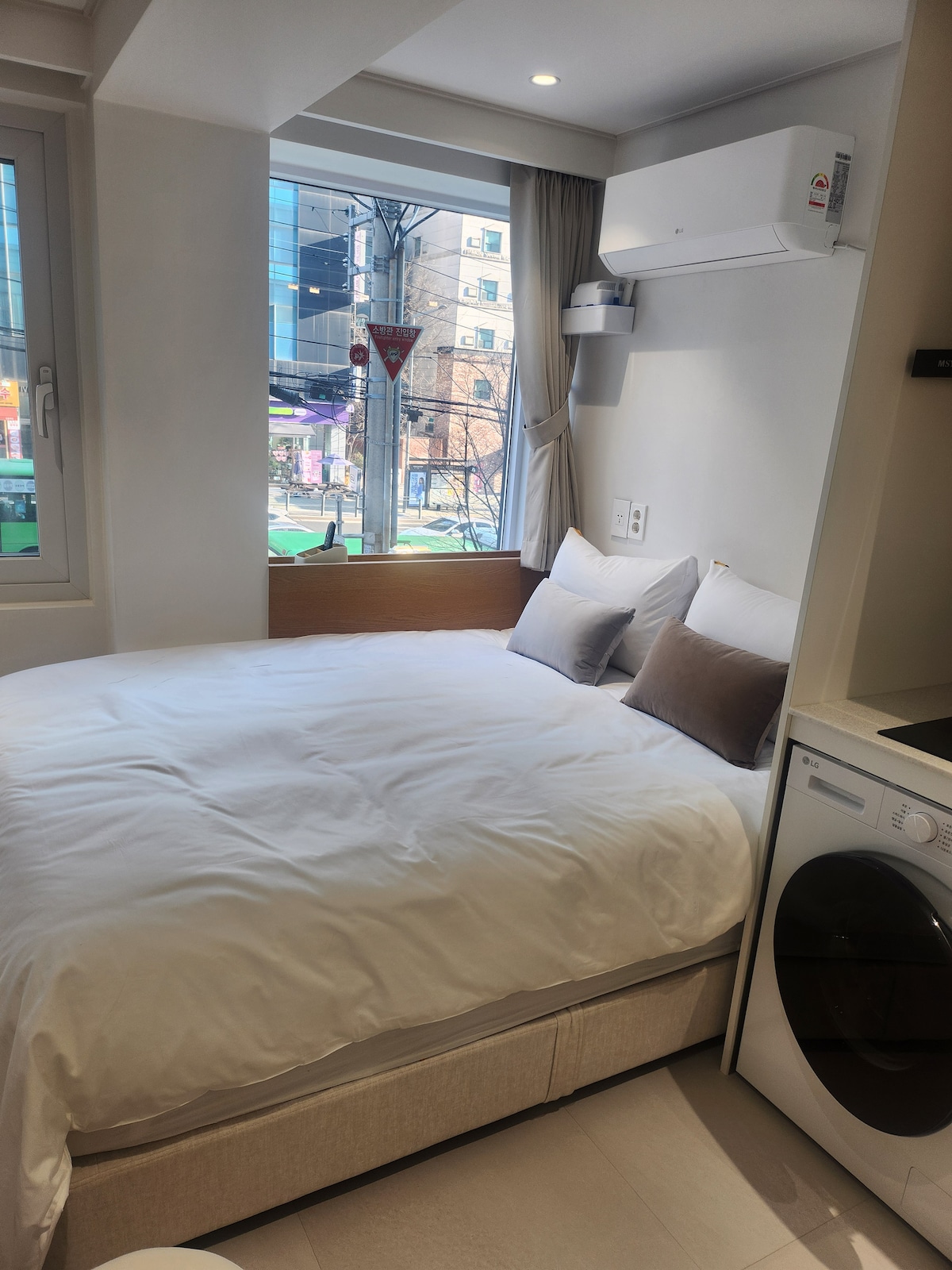 Eine neu gebaute Residenz innerhalb von 3 Minuten von 2 U-Bahnhöfen *Rezeption & Gepäckaufbewahrung & Gästelounge: B1F (Englisch- und Chinesischsprachiges Personal verfügbar, Frühstücksservice (kostenpflichtig)) *Nichtraucher-Unterkunft. Geldstrafe: 150.000 Won. * Kaffeemaschine & Begrüßungskapsel, Bidet , Trinkwasserreiniger *Alles, was du brauchst, genau wie zu Hause. *2 Gäste nutzen ein Bett. Wenn du separate Betten bevorzugst, fordere bitte im Voraus an. (bezahlt) *Für 3 oder mehr Personen wird ein Schlafsofa als Bett eingerichtet.