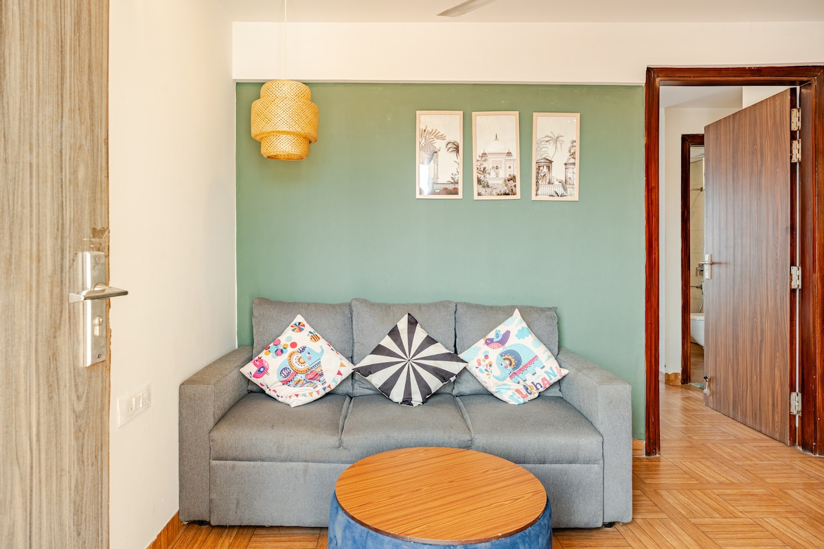 Paarfreundliches 1-BHK mit einem geräumigen Schlafzimmer, einem luftigen Wohn- und Essbereich und einem privaten Hinterhof - perfekt zum Entspannen oder Arbeiten aus der Ferne. Genieße eine voll ausgestattete Küche, ein sauberes Badezimmer, WLAN und einen Smart-TV. Das Hotel liegt im Zentrum von Gurgaon, in der Nähe von Cyber City, Einkaufszentren und der U-Bahn. Gäste lieben die ruhige Atmosphäre, das stilvolle Interieur und den gemütlichen Komfort - ideal für einen romantischen Rückzugsort oder einen stressfreien Stadtaufenthalt. Perfekt auch für lange Aufenthalte! Keine Gäste erlaubt. Maximal 2 Gäste!