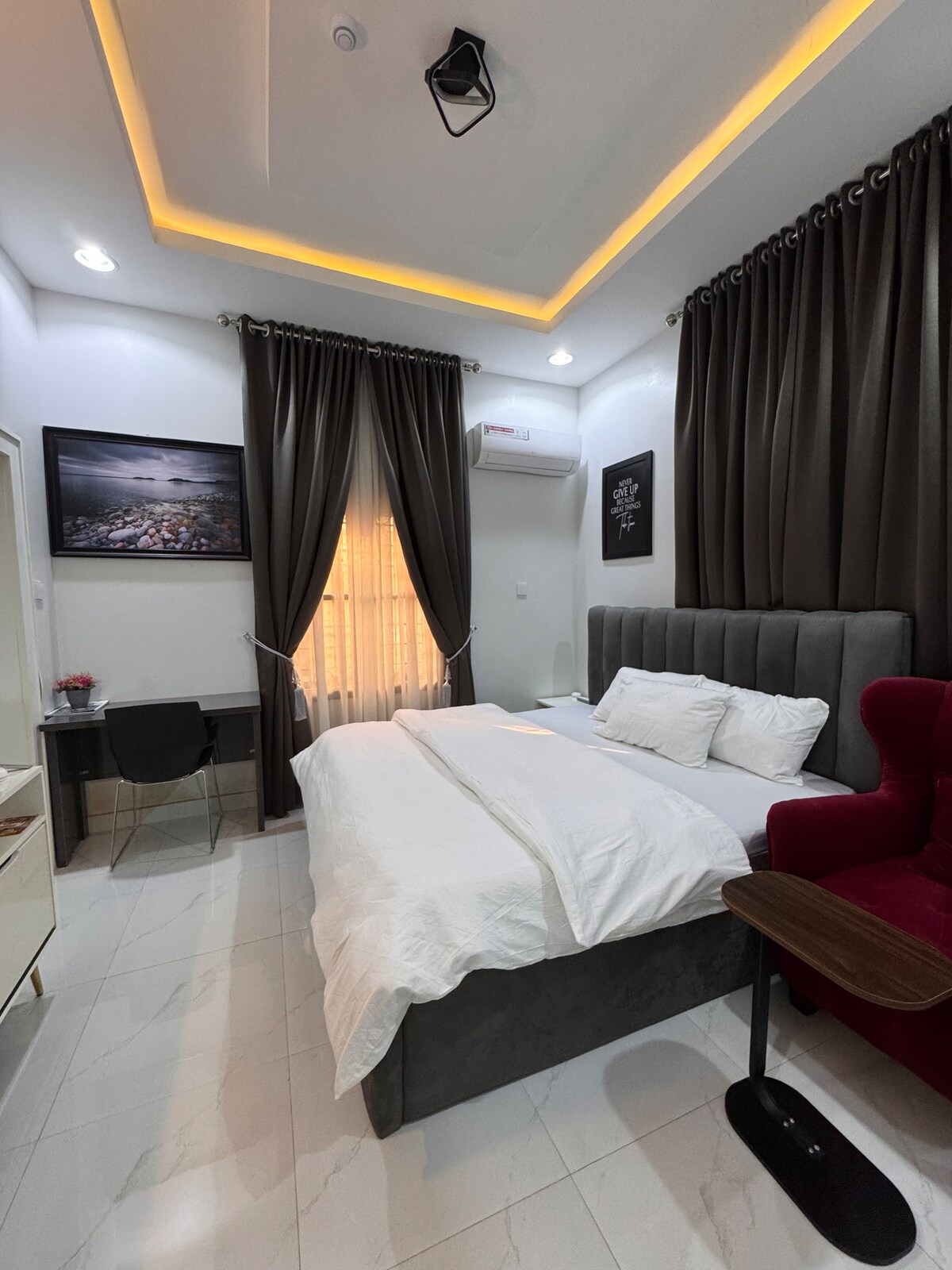 Ganz gleich, ob du geschäftlich oder privat unterwegs bist, diese Kurzzeitmiete mit einem Schlafzimmer bietet einen Rückzugsort mit Annehmlichkeiten, die sich tatsächlich wie zu Hause anfühlen. Die Unterkunft befindet sich in einem gesicherten, geschlossenen Anwesen. Sie verfügt über einen eigenen Zaun, ein Tor und eine Videoüberwachung, die dir absolute Sicherheit bietet. Wasser und Strom sind rund um die Uhr mit Wechselrichter und Generator-Backup verfügbar. Reinigungsdienste bieten Komfort, der auf deinen Zeitplan zugeschnitten ist. Du wirst mit dem Luxus und Komfort an diesem einzigartigen Ort zufrieden sein.
