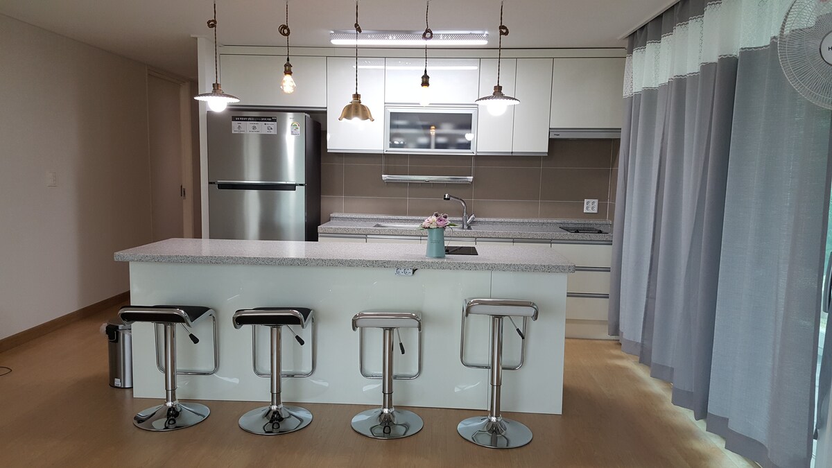 Es ist ein Einfamilienhaus in einem ruhigen Wohngebiet. Auf dem großen Rasen leben 2 kleine Hunde und Teichfische! Sie können auf dem Rasen grillen und in der Untergrund-Karaoke-Bar Spaß haben. (Es ist mit einer Klimaanlage ausgestattet.) Die Morgenlandschaft ist wunderschön. Genießen Sie die Natur an einem ruhigen und friedlichen Tisch im Hof bei einer Tasse Kaffee. . . Verschiedene Blumen blühen und blühen weiter. Das weite Feld hinter dem Gebäude bietet eine schöne Aussicht auf die Reis, die sich je nach Jahreszeit von grün nach gelb ändert. ^^ * Check-in - 16: 00 Uhr (Gepäckaufbewahrung ab dem Morgen möglich) * Check-out - 12:00 Uhr * Barbecue-Holzkohlefeuer - 20.000 KRW (Es ist möglich, wenn der Wind nicht zu stark weht, auch wenn es regnet, und im Winter wird eine Windschutzfolie und ein Ofen bereitgestellt.) * Unterirdische Karaokebar - Nutzungsregeln -Preis: 10.000 Won unbegrenzt (tägliche Aktualisierung neuer Songs)/Nichtraucherbereich/Alkohol, Getränke und Lebensmittel sind nicht erlaubt. * Wasserkocher, Klimaanlage, TV, elektrische Kochplatte, Wasserkocher, Kaffeemaschine, Bügeleisen, Mikrowelle, Waschmaschine, Toaster, Kühlschrank, elektrischer Reiskocher, Shampoo, Conditioner, Duschgel, Handtücher werden zur Verfügung gestellt.