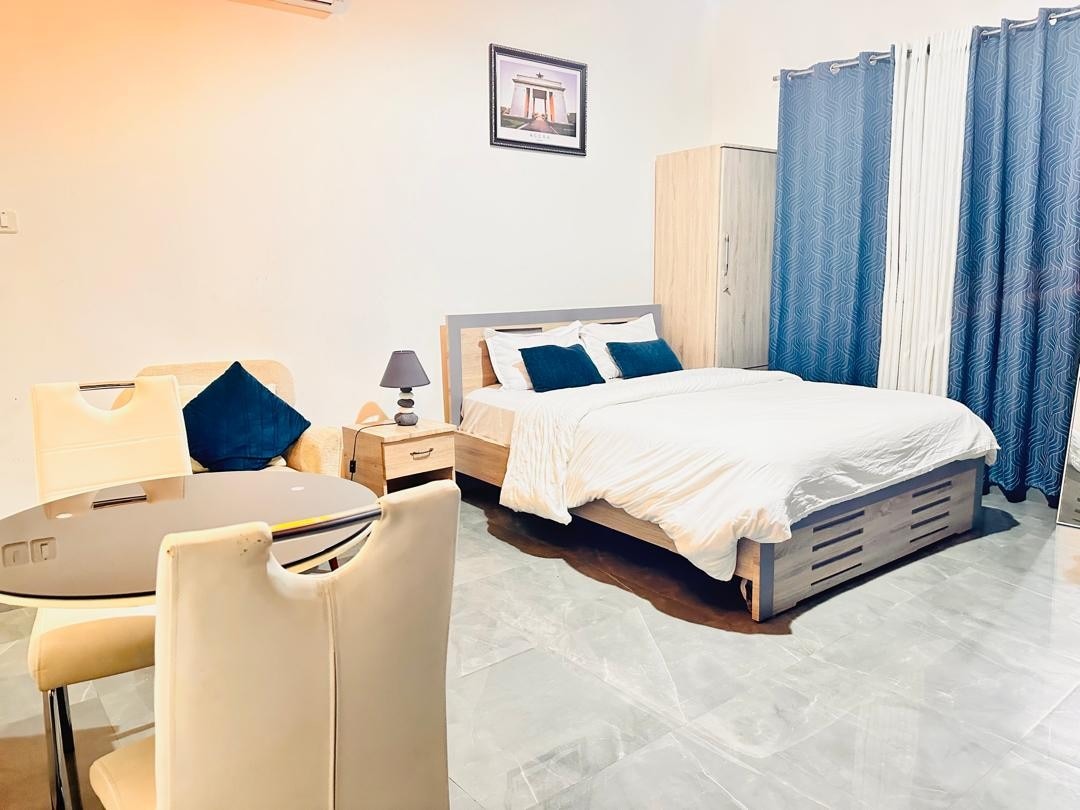 Atemberaubendes, modernes Studio, das auf Komfort und Stil ausgelegt ist. Dieser elegante, sichere Raum verfügt über ein Kingsize-Bett, einen begehbaren Kleiderschrank, eine voll ausgestattete Küche, einen 55-Zoll-Smart-TV, Highspeed-Internet, eine Klimaanlage und einen Standby-Generator. Ideal für Alleinreisende oder Paare. In einer ruhigen Gegend gelegen, nur 25 km vom Flughafen Accra entfernt. Abholung und Rücktransport zum Flughafen sind auf Anfrage gegen eine Gebühr verfügbar. Sichere Parkplätze stehen zur Verfügung. Bitte beachte, dass freitags (9:00–11:00 Uhr) und sonntags (10:00–13:00 Uhr) in der Nähe eine kirchliche Veranstaltung stattfindet.