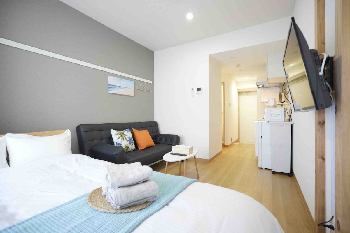 モノレール牧志駅まで徒歩5分 2021 年12月に出来たアパートでお部屋はとてもきれいです。 部屋サイズは約18平米と大きくないですが、Wi-Fi、ミニキッチン、シャワー室、ウォシュレット機能つきトイレ、ダブルベッドがあり、基本的な家具、家電そろっていますので、2名様でとても快適に過ごせます♪ 短期滞在、長期滞在どちらにも向いてます。 お部屋は5階にあり、エレベーターで移動します。 メインストリート国際通りまで徒歩5分です。アパートから徒歩5分以内に、たくさんの飲食店や、コンビニエンスストアがあり、とても立地の良い場所にあります。モノレール牧志駅は徒歩5分の場所にあり、空港からのアクセスも良いです♪ 泊港まで1㎞の場所にありますので、人気の渡嘉敷島へ行くのも便利です。 無人チェックインを行っております。チェックイン数日前にメールにてチェックイン情報をお送り致します。