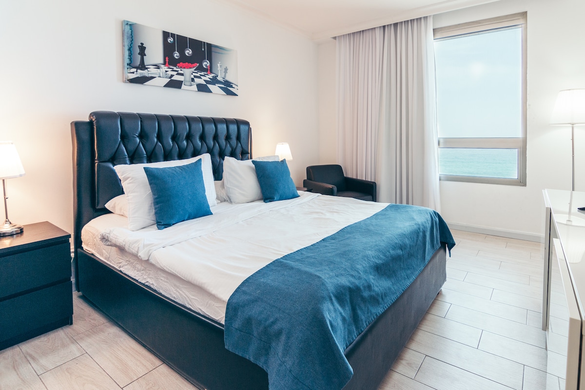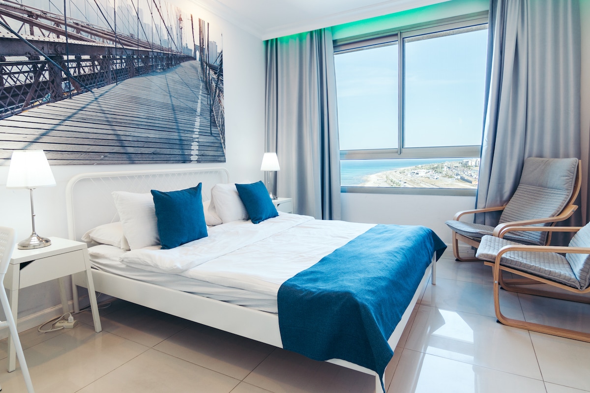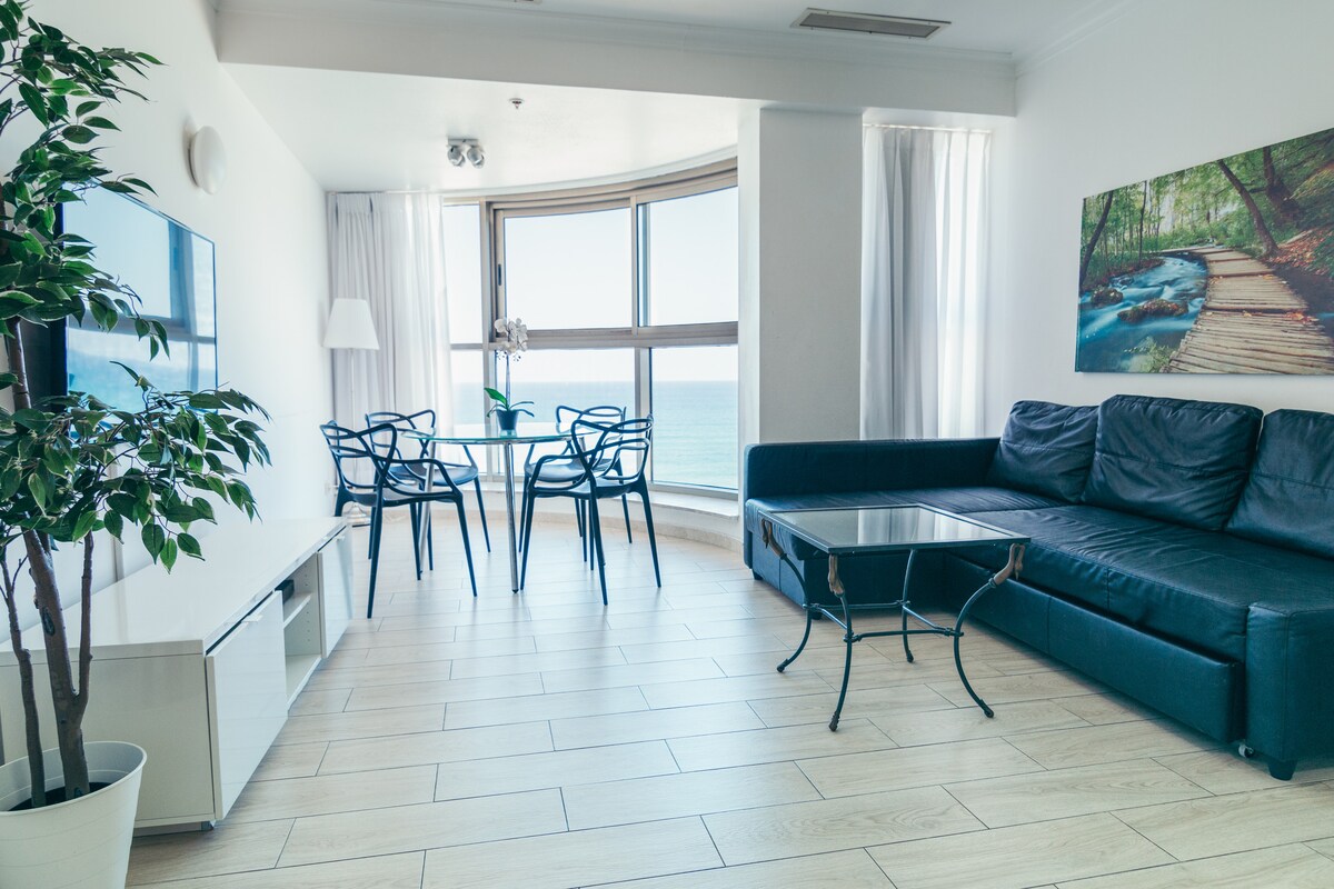 Ecksuiten im 12. Stock mit 180 Grad atemberaubendem, ungestörtem Meer- und Carmel-Bergblick. 2 Schlafzimmer mit California-Kingsize-Betten, Waschmaschine und Trockner in der Einheit, voll ausgestattete Küche, Flachbildfernseher, BALKON, luxuriöse Bettwäsche. Kabel und WLAN. Zentrale Klimaanlage. Kontaktiere mich für spezielle Preisvereinbarungen für einen Aufenthalt von mehr als einer Woche. Bitte beachte, dass die Wohnung nicht als sicher für sehr kleine Kinder oder Kleinkinder gilt. In der Wohnung oder auf dem Balkon darf strengstens geraucht werden