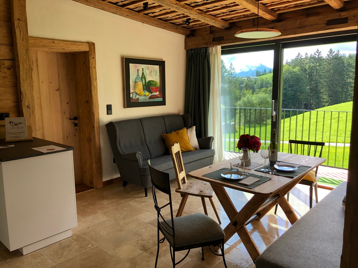 Ein Apartment in einem einzigartigen, rund 800 Jahre alten, ehemaligen Bauernhof in Abtenau am Radochsberg. Mitten in der Natur auf 760m Seehöhe. Entspanne dich in dieser besonderen und ruhigen Unterkunft, in einem stilvollen Ambiente. Das lichtdurchflutete Apartment bietet auf einer Ebene ein geräumiges Wohn- und Esszimmer inklusive top-ausgestatteter Küche, Schlafzimmer und Badezimmer für 2 Personen. Altholz, Lehmwände, und ein Natursteinboden stellen eine natürliche Klimaanlage dar.