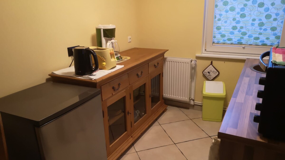 Die Unterkunft befindet sich separat im "Kleinen Häuschen", einem kompletten, freistehenden Haus, nur für euch, mit eigenem Parkplatz. Während eures Aufenthalts seid ihr die einzigen Nutzer. Es gibt ein großes Doppelbett, einen Tisch fürs Frühstück oder den Schreibkram, und ihr könnt eure Sachen in einem Kleiderschrank unterbringen. Die Küche ist bestückt mit einem Kühlschrank, einem Wasserkocher, einer Kaffeemaschine und einer Doppelkochplatte.