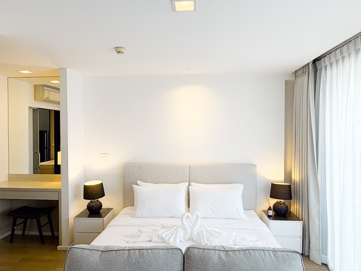 Es gibt schöne Zimmer mit modernem Stil der brandneuen, voll möblierten Eigentumswohnung, luxuriös sauber und komfortabel für Familien (mit Kindern) und Freunde. Du wirst dich im Fitnessstudio mit Whirlpool, Infinity-Pool, Sauna und Dampf ausruhen. Das Hotel liegt in einer angesagten Gegend von Chiangmai, Nimman Road, wo du tolles Essen und fast alles finden kannst, aber dennoch einen entspannenden und gemütlichen Aufenthalt nur wenige Gehminuten vom Maya Einkaufszentrum und der Nimman Street entfernt. Ich bin sicher, du wirst diesen Ort lieben!