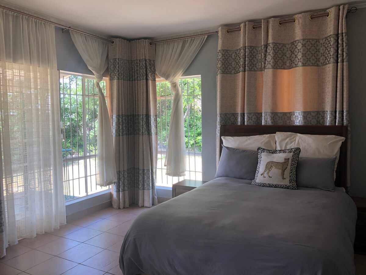 Eine Executive Suite in einer begrünten Gegend mit einem schönen, gepflegten Garten, einer Feuerstelle und einer Braai-Küche im Freien. Es gibt DSTV und unbegrenztes WLAN mit einer soliden Stromversorgung, einschließlich TV und Lichtern. Die Unterkunft ist blitzsauber mit allen modernen Annehmlichkeiten. Sie ist erstklassig. Mahlzeiten zu sehr vernünftigen Preisen können für lange Aufenthalte arrangiert werden. Du musst lediglich deine Koffer packen und kommen, um dich zu entspannen.