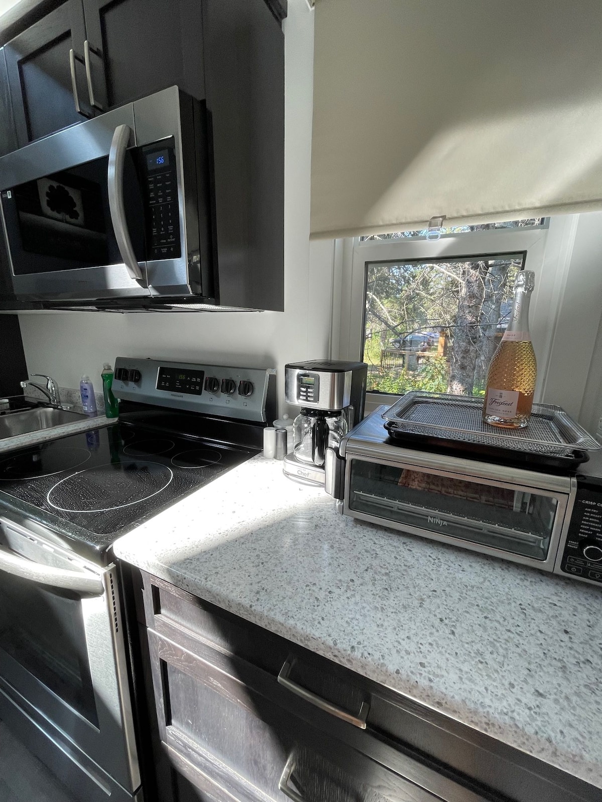 Schönes modernes Leben am See. Versteckt, nur wenige Minuten von der Innenstadt von Clear Lake entfernt. Diese malerische Hütte verfügt über jede Menge natürliches Licht, um den rustikalen beheizten Zementboden, die Zederndecken und die feinen Granitarbeitsplatten zu betonen. Sie bietet eine große Terrasse mit einem hervorragend angelegten Garten. Genieße ein Lagerfeuer mit Blick auf die natürliche Schönheit der freien Natur oder leg die Füße hoch und genieße einen Film vor dem Innenkamin. Einfacher Zugang zu Wander-/Radwegen, nur wenige Schritte von der Tür entfernt.