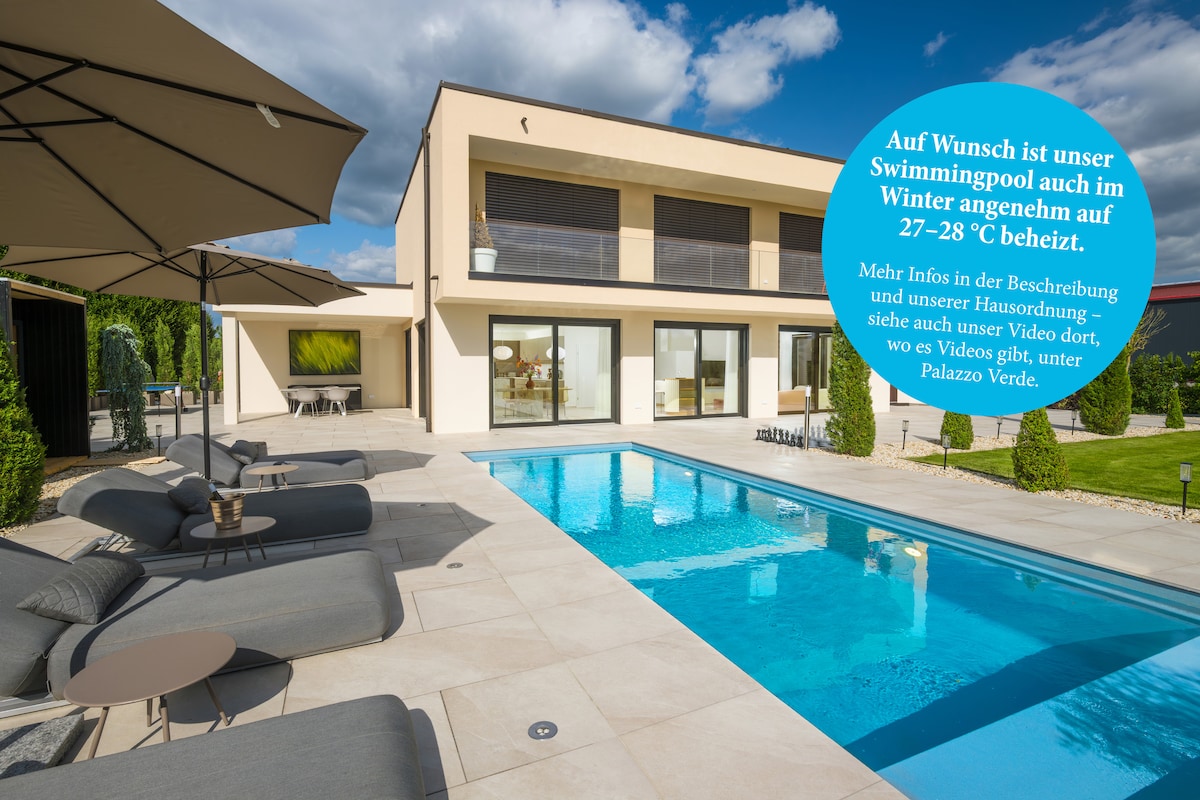 Willkommen in Ihrer exklusiven Oase. Diese atemberaubende Neubauvilla bietet ein unvergleichliches Erlebnis von Luxus, Komfort und Ruhe. 187 qm Fläche, eigener Garten, Swimmingpool (auch im Winter mit – 27–28 °C garantiert optional nutzbar (Details/Preise siehe Hausregeln), Sauna und Whirlpool, 2 Garagen. Das Palazzo Verde eignet sich hervorragend als Location für Foto- und Videoaufnahmen. Außerdem beinhaltet die Villa 2 Schlafzimmer, ein Badezimmer u. eine moderne vollausgestattete Küche.
