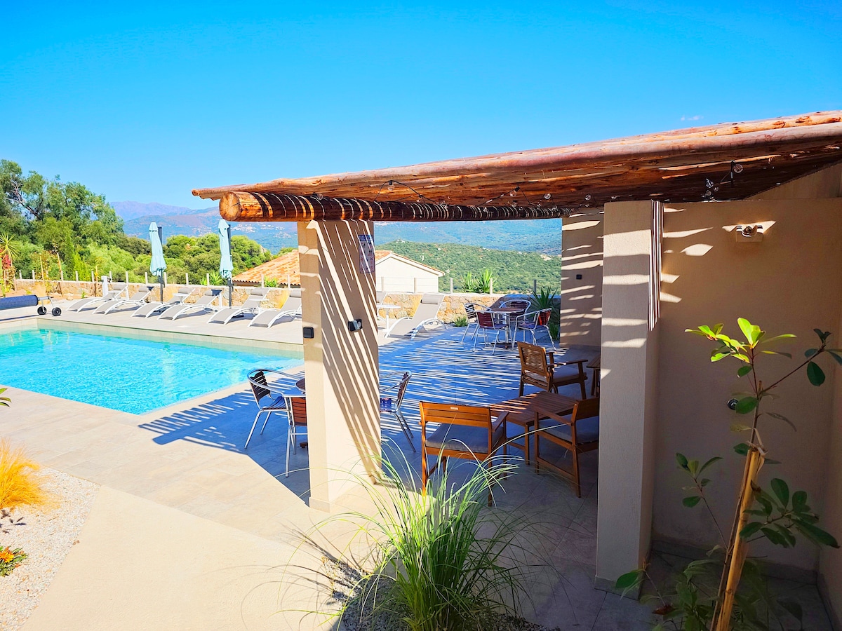 Im Herzen der Macchia, eingebettet auf einem Hügel mit herrlichem Meerblick, verfügt diese kleine charmante Residenz über 5 schöne Apartments mit Terrassen, die auf zwei Villen verteilt sind. Maximal zwanzig Personen haben Zugang zu diesem privilegierten Ort, der sich auf dem Gebiet der Elahen Hirsche (endemische Art) und der Rotmilane befindet. Die Apartments bieten luxuriöse Dienstleistungen (großer beheizter Gemeinschaftspool, SPA, Sauna).