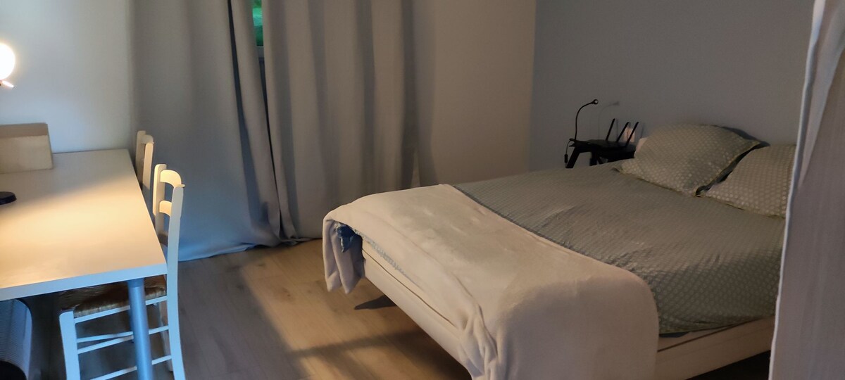 Unabhängige Unterkunft mit viel Charme von 62 m². Diese Unterkunft wurde 2020 komplett renoviert und verfügt über alles, was für 2 Personen benötigt wird. Es eignet sich genauso gut für einen kurzen Aufenthalt oder für einen ruhigen Urlaub. Es besteht aus einem großen Wohnzimmer von 45 m², 1 Schlafzimmer mit 1 Doppelbett , einer Büroecke, einer ausgestatteten Küche, einem Kühlschrank, einem Kochfeld, einem Backofen, einem Badezimmer, einem WC. Schöne Terrasse, die angrenzt, um ruhige Momente zu verbringen. Wifi.
