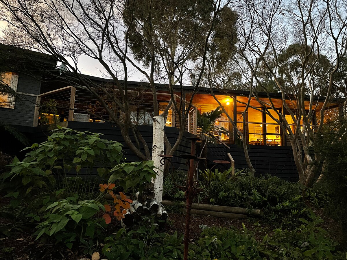 Das Canopy House, Healesville: Tolle Aussicht, Holzfeuer, Split-Systeme, ganzes Haus in der Nähe der Stadt, privat und abgelegen. Es ist eine einzigartig gestaltete geräumige Hütte, die hoch auf dem Hügel liegt, 1 Kilometer vom Stadtzentrum entfernt, mit etablierten malerischen Gärten. Es hat den Komfort, in der Nähe der Stadt zu sein, während es privat und abgelegen ist. Ideal für ein oder zwei Paare im Retreat-Stil Offener Wohn- und Unterhaltungsbereich, gemütlich und warm im Winter, während er in anderen Monaten offen und luftig ist.