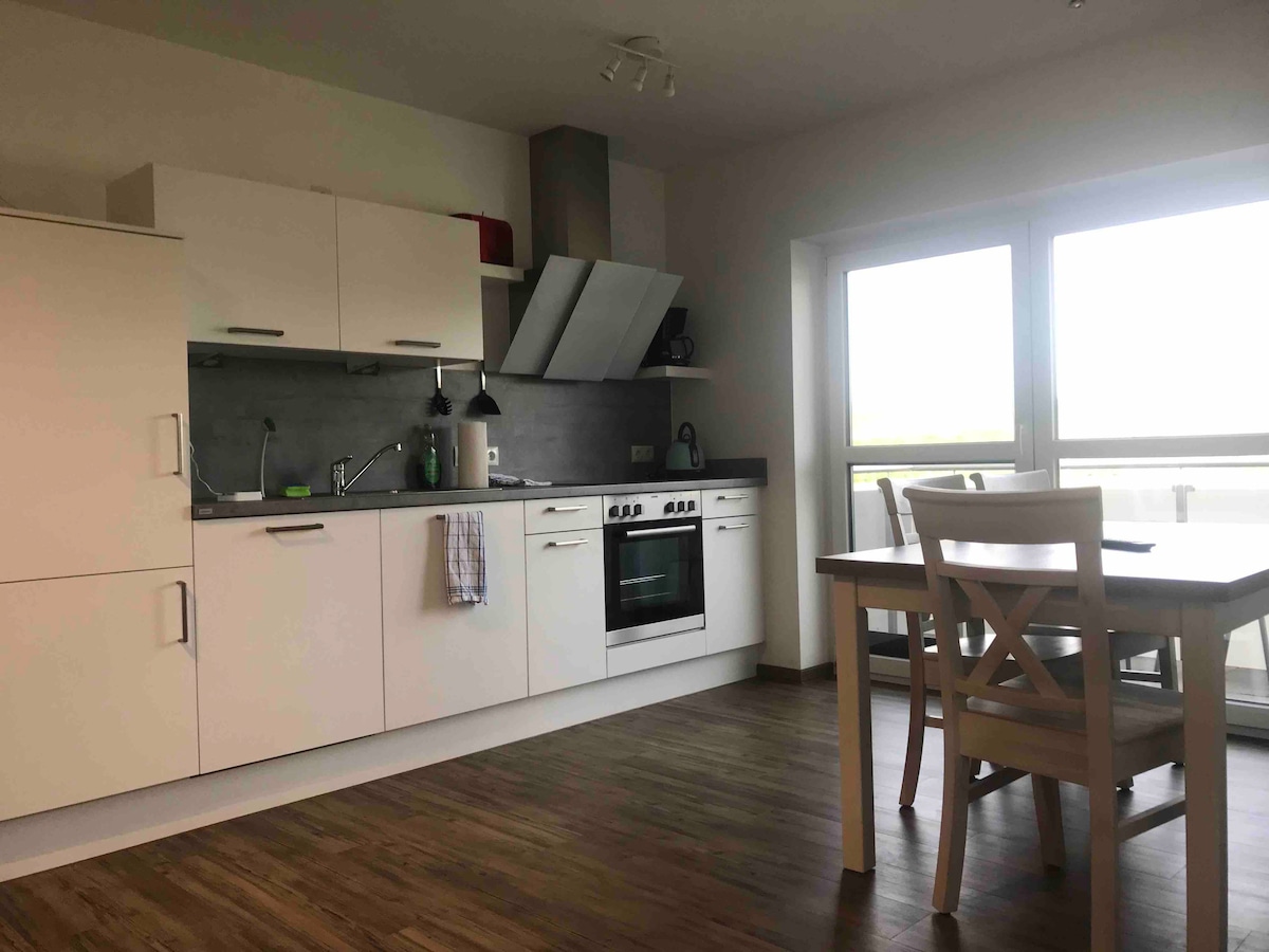 Entspann dich in dieser besonderen und ruhigen Unterkunft. Die DG-Wohnung im 2.OG bietet 2 Schlafzimmer 1 Wohn & Esszimmer, Küche und Bad. Das Haus ist ein Neubau und entsprechend ist die Innenausstattung in hellen und freundlichen Farben. Die Wohnung ist in einer ruhigen Lage und hat einen schönen Blick ins Grüne, auf dem es sich prima vom Alltag erholen lässt. Ausstattung: Fußbodenheizung, komplette EBK inkl. Geschirr usw. begehbare Dusche, bodentiefe Fenster im Wohn-Küche u.Essbereich.