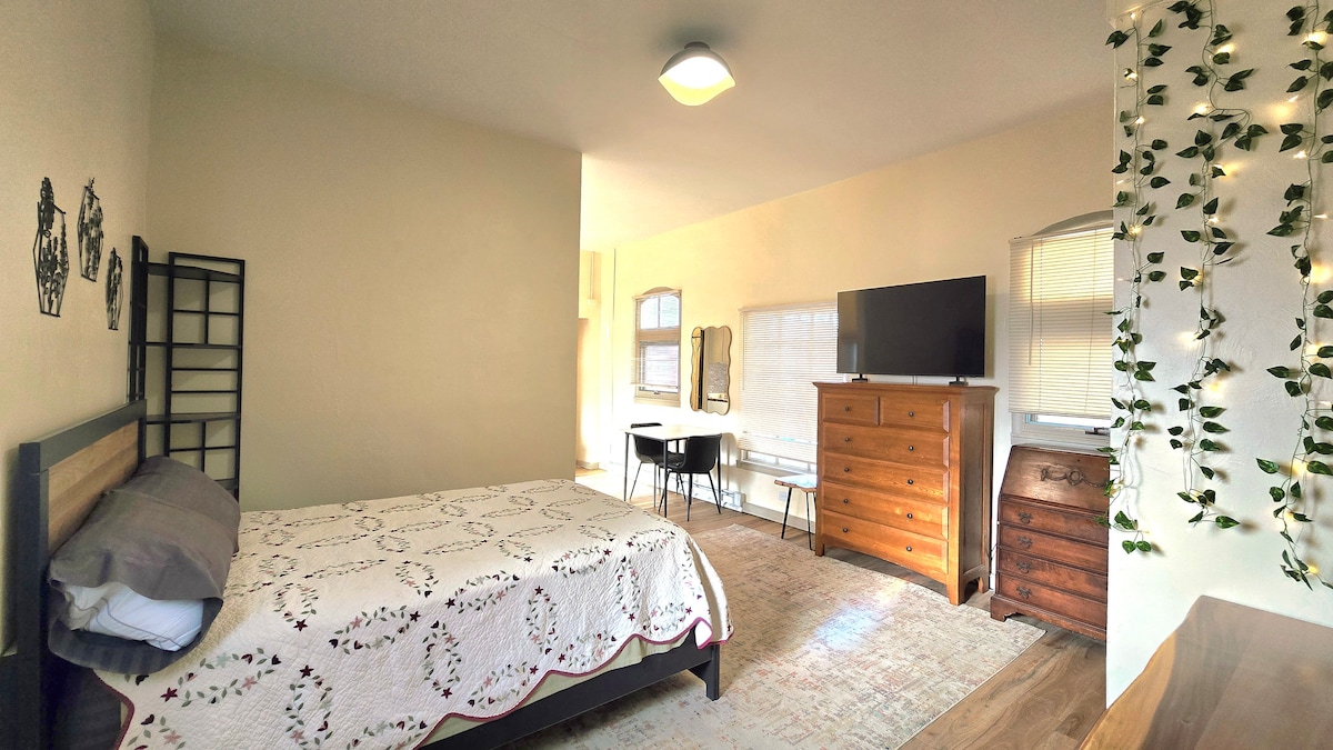 Verliebe dich in den Charakter und Charme dieses zentral gelegenen, hellen, historischen Gebäudes und genieße die neuesten Updates und modernen Annehmlichkeiten wie einen Geschirrspüler, neue Arbeitsplatten, frische Farbe, aktualisierte Möbel und neue Bettwäsche. Das Schlafsofa und die versenkbaren Türen ins Wohnzimmer dienen als privates zweites Schlafzimmer. Mit einem 50-Zoll-TV und einem Kamin ist dies unser Schlafzimmer der Wahl! Neben dem Hauptschlafzimmer findest du einen separaten Büroraum mit einem Schreibtisch und einer Tür, die für Privatsphäre geschlossen werden kann.