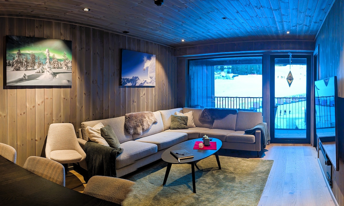 Luxury and exquisite details adorn the open interior, boasting a remarkable 6-meter ceiling height. It doesn't get any better for a premium experience! The apartment offers true ski-in, ski-out access with a tow rope right outside the door, and easy access to cross-country ski trails. You are in immediate proximity to Fyri Resort, shops, and other activities. You won’t find a better location.