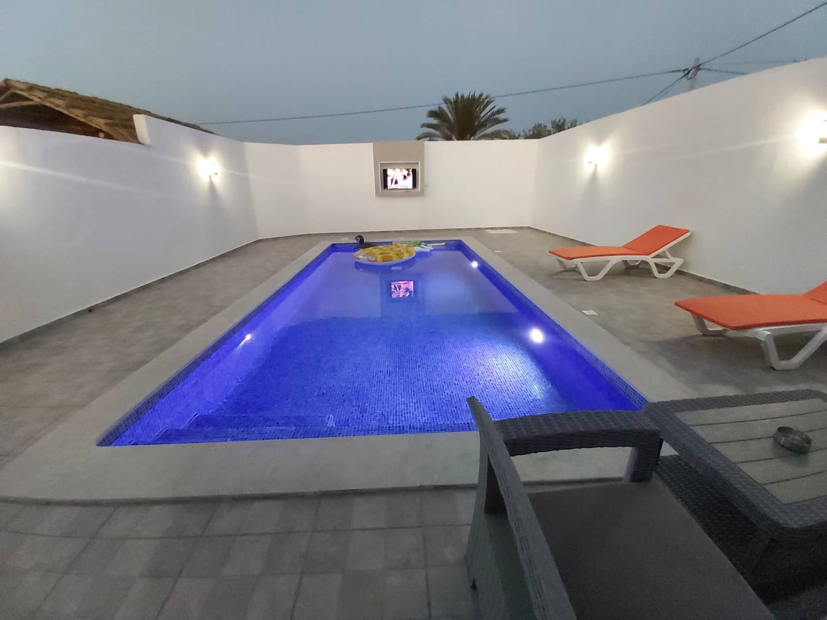 Willkommen in unserer Villa ohne Gegenüber nach Süden, in ruhiger Lage Sie verfügt über einen großen privaten Pool, ein Planschbecken, ein großes Wohnzimmer, eine ausgestattete Küche, eine Pergola-Ecke für Momente der Entspannung, einen Grill, eine gemütliche Ecke... Gesellschaftsspiele stehen zur Unterhaltung zur Verfügung 200 m von der Moschee entfernt, und mit dem Auto: 2 Minuten vom Supermarkt, 5 Minuten vom Strand und 15 Minuten vom Stadtzentrum von Midoun und Bourgo Mall entfernt Auto ist sehr zu empfehlen