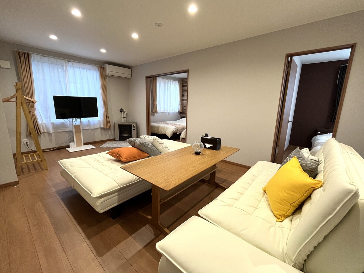 [Neubau-Villa, in der Sie ein überwältigendes Gefühl der Freiheit genießen können] Die im November 2024 fertiggestellte neue Villa „Morine“ ist ein moderner und raffinierter Raum in einer ländlichen Gegend. Die ländliche Umgebung und die Aussicht auf die Skigebiete, die sich vor den großen Fenstern erstrecken, lassen Sie das Gefühl haben, in einem Resort zu sein. Im Sommer können Sie mit Ihrer Familie und Freunden eine schöne Zeit im Grillbereich verbringen. Die Villa befindet sich im beliebten Higashichawa, wo es viele tolle Orte wie schicke Cafés, Bäckereien, Montbell-Geschäfte und Straßenstationen gibt. Die nahegelegene Skistation von Kammo (900 m), das Onsen-Erlebnisbad Kitron und der Golfplatz bieten Ihnen die Möglichkeit, die Natur zu genießen und sich zu entspannen. Die Villa ist mit 4 Doppelbetten und 2 Einzelmatratzen (alle von Simmons) ausgestattet, um einen angenehmen Schlaf zu gewährleisten. Mit zwei Bädern und Toiletten, einem geräumigen Wohnzimmer und sorgfältig ausgewählten Möbeln ist es ideal für Gruppen. Bitte verbringen Sie eine besondere Zeit in der Natur.
