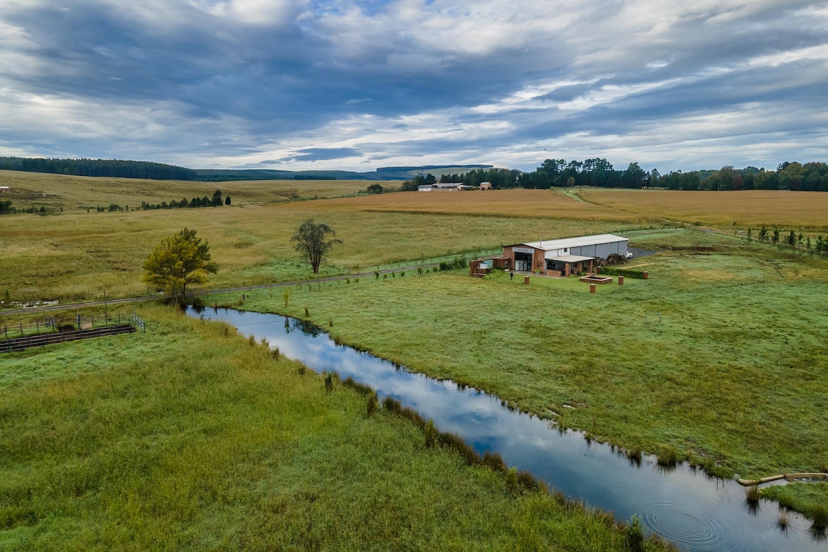 Malerisches Ferienhaus für 4 Personen mit einem exquisiten Blick auf den Damm... der perfekte Ort, um sich zu entspannen. Die kleinste von drei Einheiten auf dem Grundstück, ist es perfekt für Paare oder eine kleine Familie auf der Suche nach einer schönen Midlands-Auszeit. (Die anderen Einheiten sind ein Bauernhaus für 6 Personen – siehe „Pennygrove Farmhouse“ und ein umgebauter Schuppen für 6 Personen – siehe „Nguni Cottage“) Schöne Spaziergänge und Barschfischen, um dich tagsüber zu beschäftigen, und eine Feuerstelle für die kalten Midlands-Nächte. Lastabwurffreundlich.