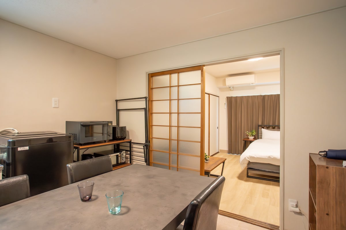 Dies ist eine großartige Lage im Herzen von Hiroshima, nur 7 Gehminuten vom Friedenspark entfernt. Es ist der ideale Ort zum Entspannen nach einem Tag Sightseeing in Hiroshima. Der Eingang verfügt aus Sicherheitsgründen über ein automatisches Schloss. 2-Zimmer-Wohnung ・Schlafzimmer 2 - 2 Doppelbetten ・Ein Doppelschlafsofa ・Küche ・Toilette ・Badezimmer *Zusätzliche Bettwäsche für das Schlafsofa ist vorhanden. *Bitte verwende die Ersatzbettwäsche auf eigene Faust. Insgesamt können bis zu 6 Personen im Zimmer wohnen.
