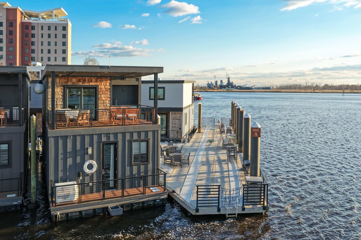 Welcome to The Cove Riverwalk Villas, Wilmington’s most unique vacation rental community! Experience the elegance of Napa, a luxurious houseboat inspired by Napa Valley. With dark woods, rich colors, and winery-themed decor, it offers a floating escape like no other. Enjoy breathtaking views of the Battleship NC from the deck and unwind in plush surroundings. A dedicated desk provides space for work or reflection, making Napa the perfect waterfront retreat for relaxation and inspiration.