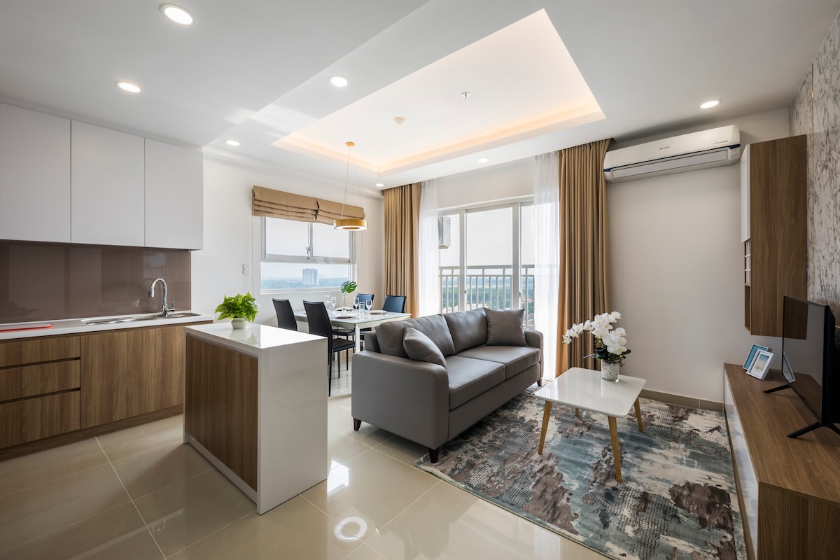 Diese einzigartige Unterkunft hat einen sehr persönlichen Stil. 1-Bett-Wohnung, direkt auf der 4. Etage gelegen (Hauswirtschaftsraum des Gebäudes: Einfacher Zugang zum Schwimmbad, Kinderspielplatz, Blumengarten, Grillplatz im Freien, Sauna, FITNESSRAUM), die Lage im Stadtzentrum findet regelmäßig auf Konferenz-, Gewerbe-, Service-Meetings statt. Es gibt einen kostenlosen Bus zum Zentrum von Ho-Chi-Minh und umgekehrt.