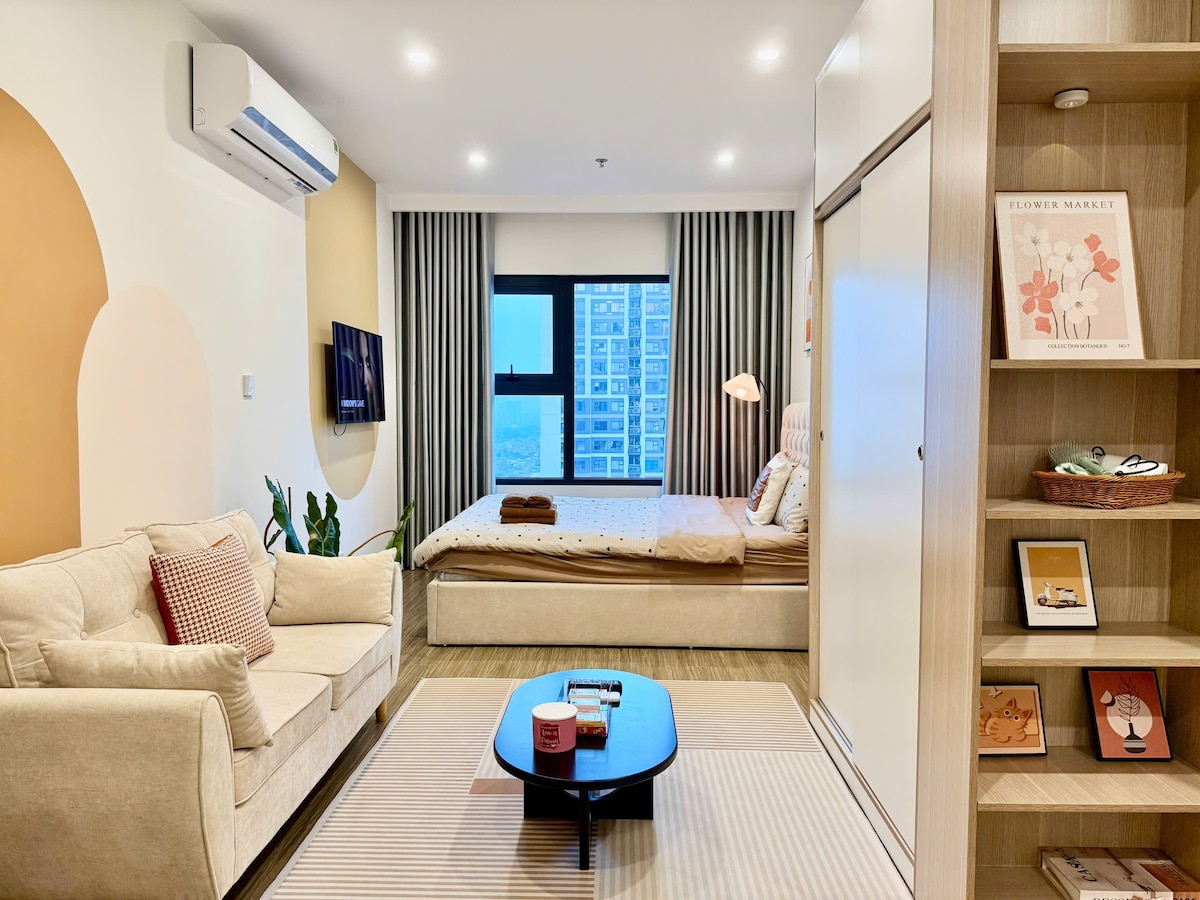 Welcome to Mochie Homestay! Experience a perfect "All-in-one" retreat in our sun-drenched, 31st-floor studio. • The Space: Modern & stylish. Features a premium Queen bed, large sofa, private Billiards table, and 4K TV with Netflix. • Kitchen & Bath: Fully equipped kitchen and a pristine, hygienic bathroom. • Amenities: 4-season pool, Zen gardens, and a scenic lake. • Location: Supermarkets & cafes at your doorstep. 15-20 mins to Center, near Aeon Mall, Vincom, Vietnam Military History Museum.