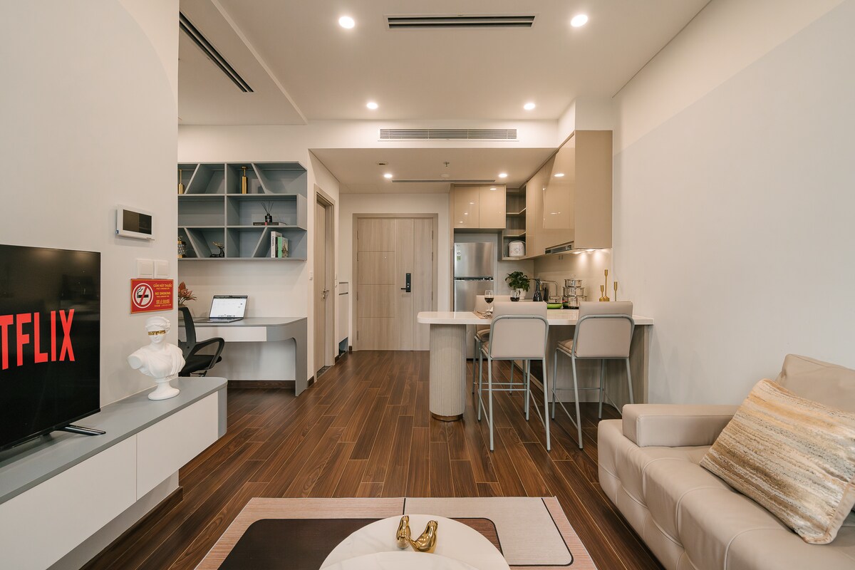 Staying here, you’ll enjoy access to outstanding facilities: a breathtaking infinity pool, a 4-season heated swimming pool, a scenic walking lake, and a fully equipped gym. The neighborhood is vibrant yet peaceful, making it perfect for both business and leisure travelers. Location is unbeatable – only minutes away from Mỹ Đình Stadium, the National Convention Center, and administrative hubs of Mỹ Đình and Thanh Xuân.