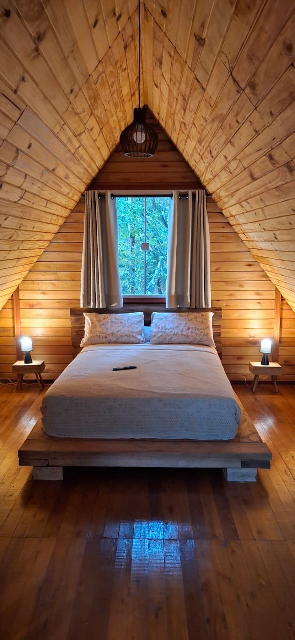 Glas-Loft mit voller Privatsphäre, doppelter Höhe mit Zwischengeschoss, industrieller und rustikaler Deko-Mix mit thematischen Elementen. Das Loft verfügt über einen eigenständigen Check-in, eine warme und kalte Klimaanlage, eine Marmorinsel mit Kochfeld, einen elektrischen Heißluft-Backofen, eine Sandwichmaker, eine Nespresso-Kaffeemaschine und einen internen Grill, WLAN, einen Fernseher, Roku, ein Queensize-Bett mit 200 Drähten, Gasheizdusche, Föhn, WC-Dusche, Verdunkelungsvorhänge, Kühlschrank ,Kamin , Gemeinschaftspool 3 Chalets.