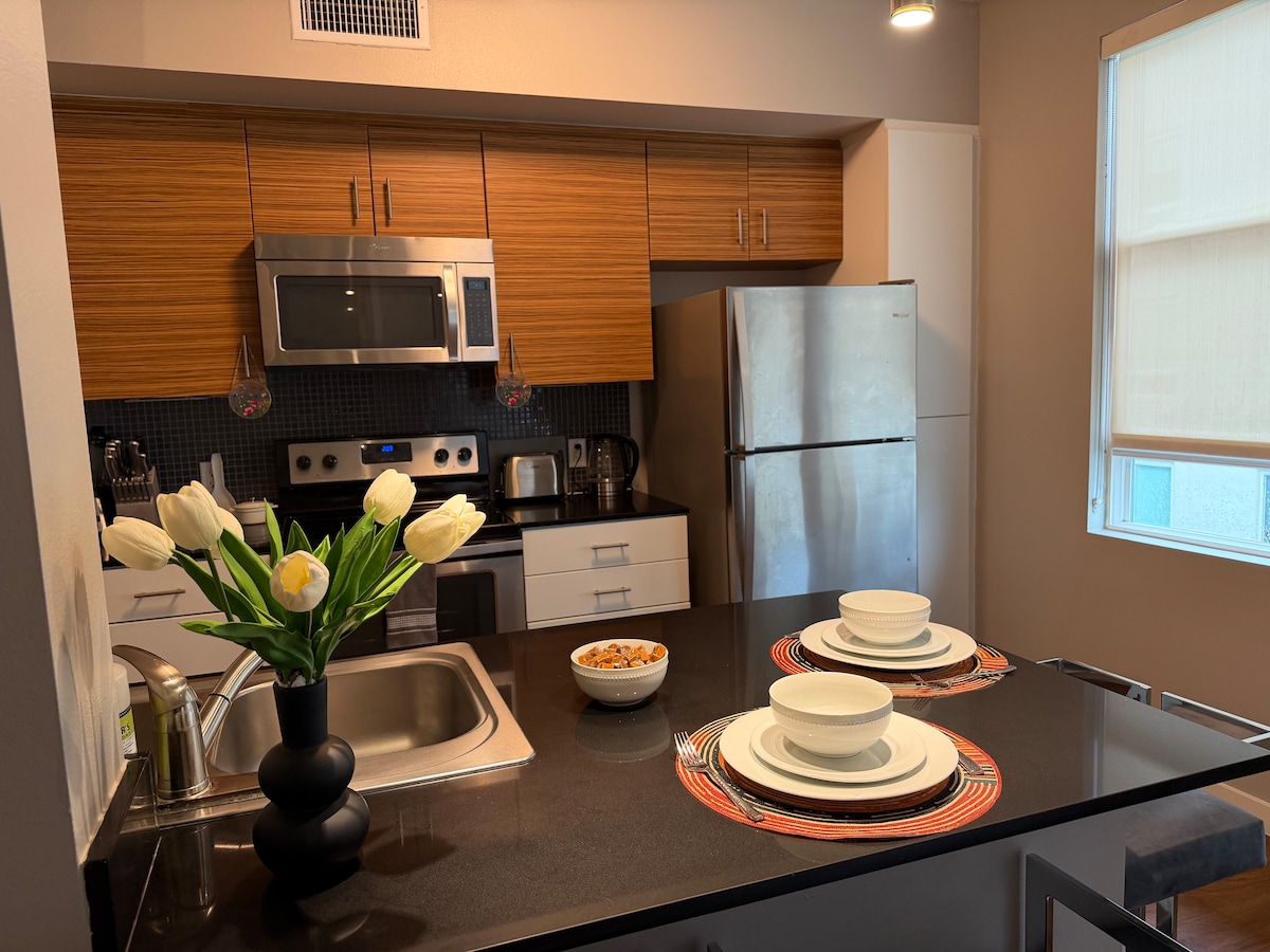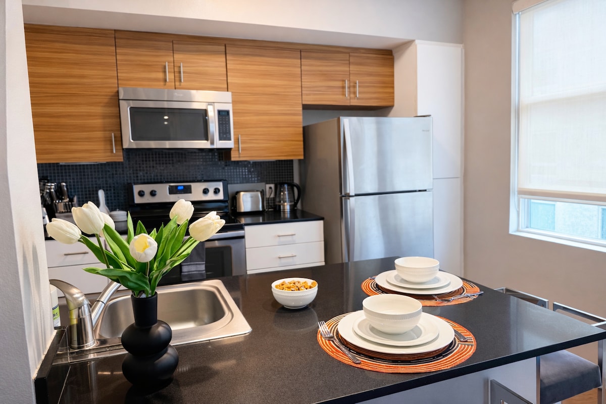 Experience luxury in one of Los Angeles' premier high-rise buildings, located on Mid-Wilshire, between Beverly Hills, and West Hollywood. Enjoy stunning views from this modern, corner unit one bedroom plus a den turned into an office. Relax at the rooftop pool, unwind in the jacuzzi, or enjoy the outdoor fireplaces. On the 5th floor, find an outdoor lounge, an indoor clubhouse with office spaces, more BBQ areas and a gym. Complimentary valet parking and high-speed internet.
