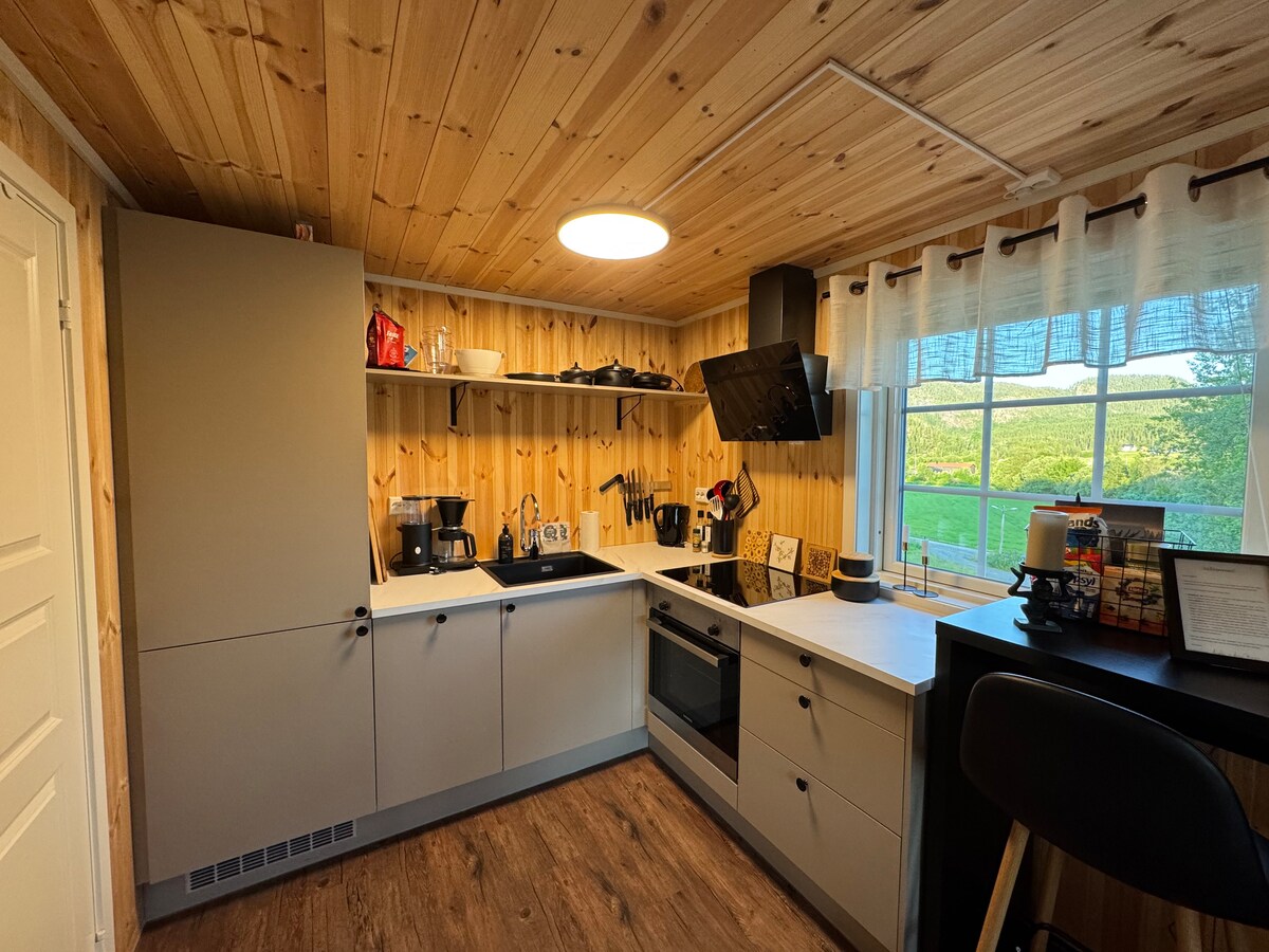 Willkommen in unserer hellen und neu renovierten Kellerwohnung mit tollem Blick auf das Dorf! Hier wohnen Sie komfortabel und ruhig, ein kurzer Abstecher von der E6 in Grong. Ideal für Familien, kleine Gruppen oder Paare, die einen angenehmen Aufenthalt in Namdalen verbringen möchten. Die Wohnung verfügt über zwei Schlafzimmer – beide mit separaten Doppelbetten – sowie über zwei zusätzliche Matratzen, die bei Bedarf verwendet werden können. Du hast Zugang zu deinem eigenen Wohnzimmer im Untergeschoss, einem Fitnessraum, einem neuen Badezimmer mit Waschmaschine und Wäschetrockner. (Hinweis: Wir haben keine Küche.)