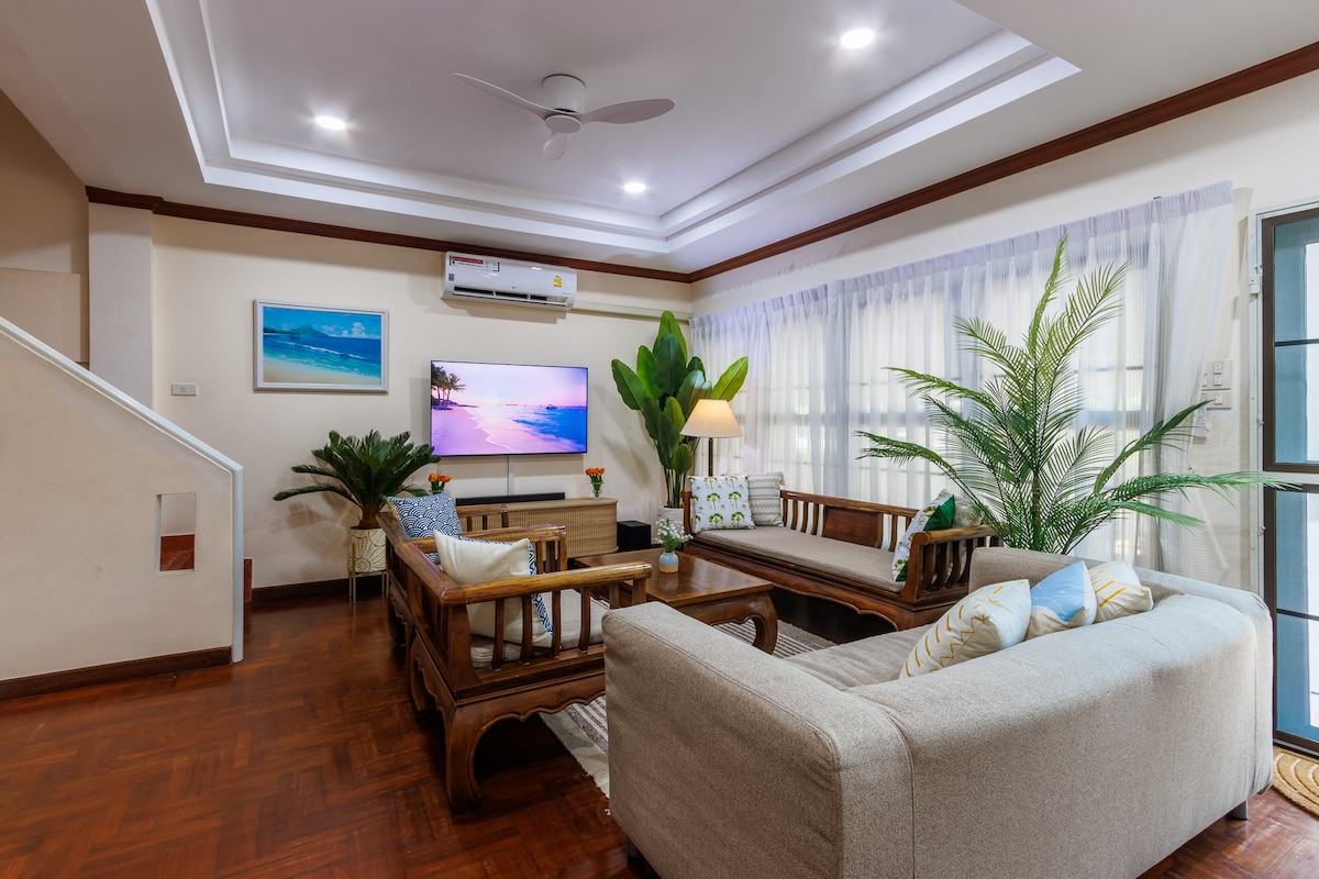 A unique four-level beach retreat just 200 metres from the stunning Khao Takiab Beach - located just south of Hua Hin - combining privacy, space, and tropical comfort. Bright, airy interiors with high ceilings and a unique vertical layout create a relaxed yet elegant atmosphere, perfect for families or groups. Enjoy access to a pool, lush garden, and family-friendly surroundings, with cafés, restaurants, and markets just minutes away - ideal for a memorable stay in Hua Hin.