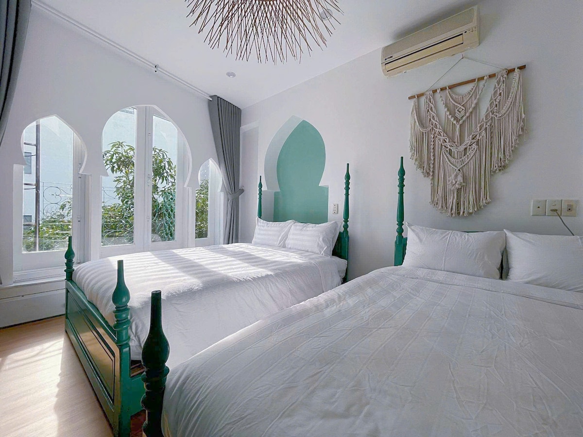Unser Doppelzimmer mit Kingsize-Doppelbett im An Nhien House verbindet modernen Komfort mit natürlicher Schönheit. Dieses geräumige Zimmer verfügt über zwei Kingsize-Betten, eine stilvolle Einrichtung und große Fenster, die viel natürliches Licht hereinlassen. Tritt nach draußen in unseren Garten, um dich zu entspannen oder den Bauernhof zu erkunden. Entspanne dich nach einem Tag voller Abenteuer im Komfort deines Zimmers und genieße die perfekte Mischung aus Luxus und Natur.