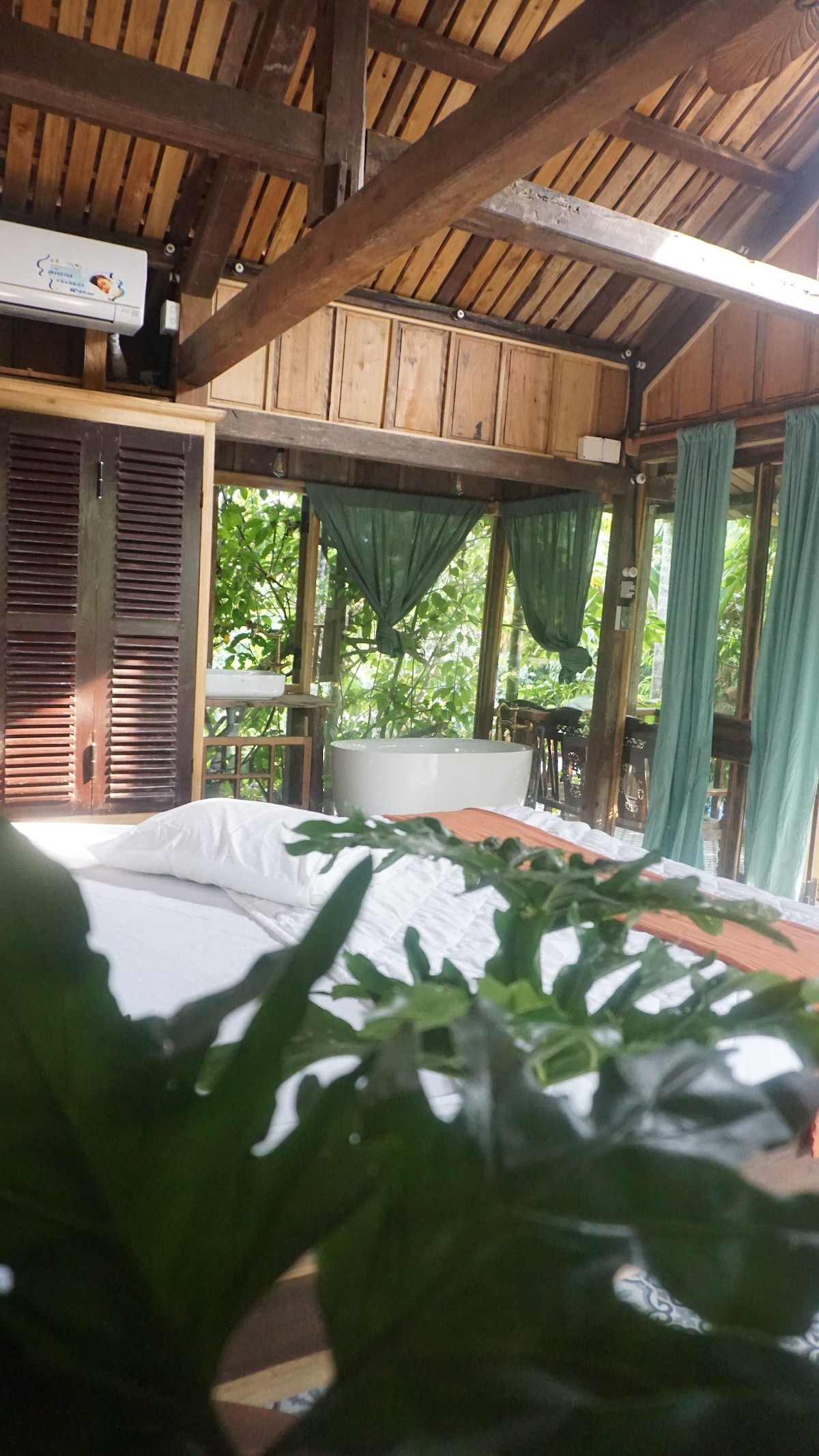 A house by the riverside ,in the center of city .There are 2 floors ,each floor 55m2 . On the first floor :1 dbl room+A.C. , living room + smart T.V. , dinner table , 1toilet+shower , kitchen . On the 2nd floor : 1 dbl room + A.C. , 1 toilet + shower . 1sgl bed + water fan in open room . Especially 1 balcony on the riverview . A comfortable house with evrything you need , for 4 or maximum 5 persons ( no fee for the 5th person) The gentleness of the river gives you a pleasant stay ..