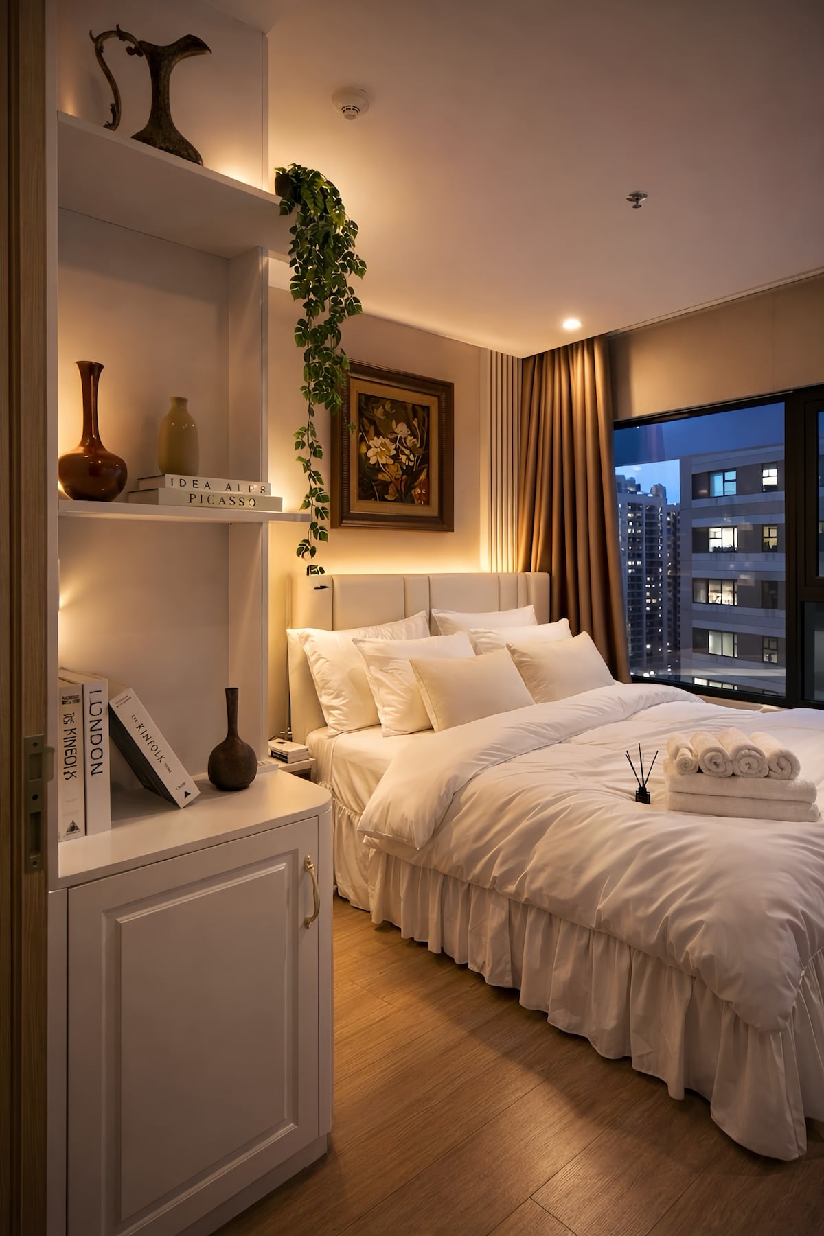 ✨ Ein gemütliches, modernes Studio mit zwei luftigen Balkonen mit Blick auf einen ruhigen Seeblick, ein funkelndes Stadtbild und magische farbverändernde Brücken bei Nacht. Perfekt für Paare, Freiberufler, Buchliebhaber, lange Aufenthalte und ruhige Rückzugsorte. Mehr als ein Ort zum Schlafen - es ist ein stilvoller, warmer und inspirierender Wohnraum inmitten der Natur im Ecopark, der „grünen Oase“ neben Hanoi ... Không ch ¥ là ch ¥ ng ¥ – mà là không gian s ¥ ng ch ¥ t, đ ¥ y c ¥ m cúng và ¥ m cúng, gi ¥ a thiên nhiên hoa c ¥ c ¥ a "¥ c ¥ o xanh" Ecopark.
