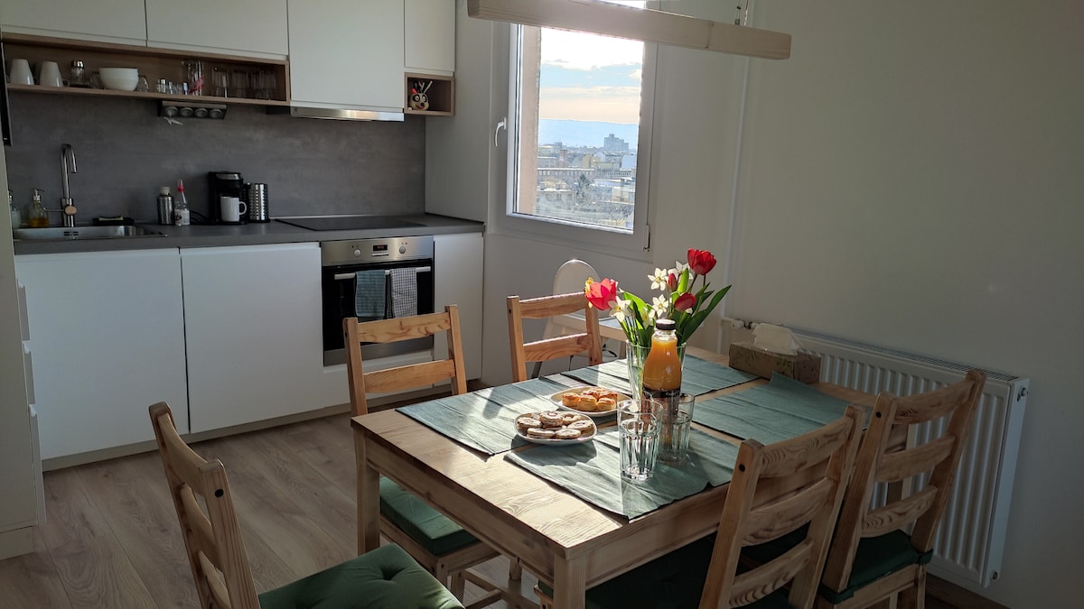 Family-friendly, fully equipped, newly renovated, sunny apartment is located in a green neighborhood. The apartment is on the 9th floor with a balcony, it offers a spectalular view over the city, and a great interior with modern and stylish decor. The location in the free parking area (~50m) makes it ideal for those traveling by car. It is not far from Széchenyi Bath, Heroes' Square, City Garden, Paskál Thermal Bath and Puskás Stadion. The apartment can accommodate 4+2 people + child in a crib.