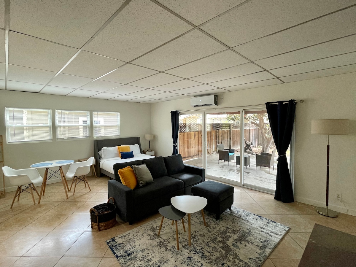 Stylish, cozy apartment with high ceilings and lots of light. The studio is 12 minutes from Disney and Anaheim Convention Center, 10 minutes to Chapman University and 20 minutes to the beaches. Amenities you'll love; 55" TV with Disney+, YouTube TV, Netflix, WiFi, Tea and coffeemaker, A/C, fridge-freezer, toaster, microwave, cook-top, pots & more. Comfy queen bed, self check-in anytime.
