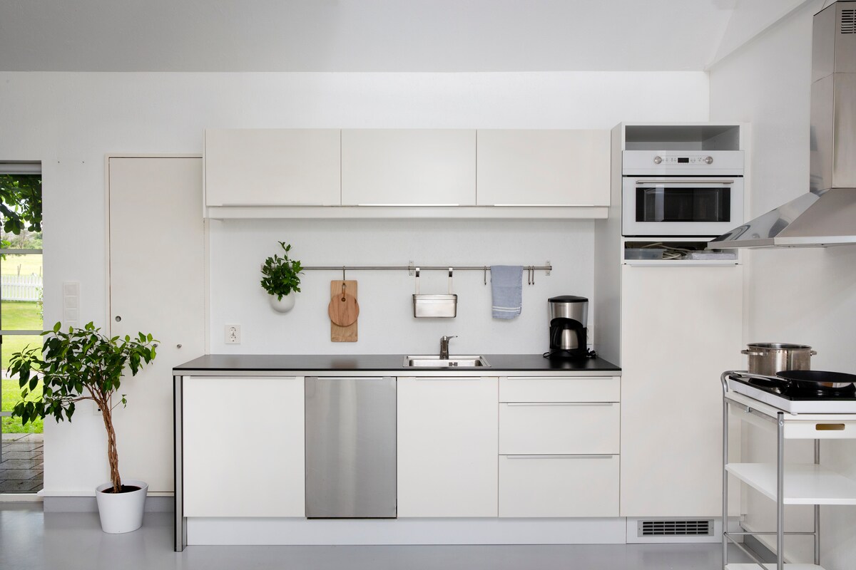 Haus auf einer Insel, entworfen vom preisgekrönten Architekten Espen Handegaard. Große Fenster/Schiebetüren zur Terrasse. Weitläufiger Garten. Ausschließlich organische Materialien: Holzböden, Holzvertäfelung an Wänden und Decke. Fünf Meter Deckenhöhe. Ruhige Atmosphäre. Fußbodenheizung. Gefliestes Badezimmer, Waschmaschine. Küche mit Kühlschrank und Geschirrspüler. Angenehm warm im Sommer, im Winter sind alle Böden in allen Räumen beheizt. Holzwerkstatt. Nur 400 m zum Ziegenhof in Strandnähe.