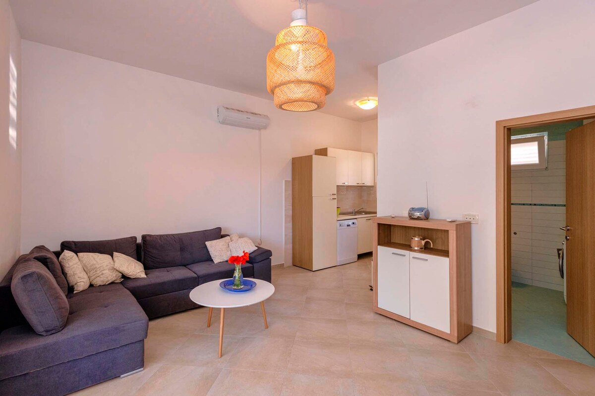 Apartman je na odličnoj lokaciji u obiteljskoj kući u mirnom kvartu i svega 5 minuta šetnje do samog centra grada. Svi apartmani se čiste i dezinficiraju po preporukama airbnba Apartman ima 45 m2 i prostranu terasu od 15 m2. Ispred apartmana je vrtni kamin i veliko parkiralište u dvorištu kuće. Plaža je udaljena 50 m. U blizini su restorani i kafići. Mjesto za iznajmljivanje skutera,auta i brodova je udaljeno 70 m. Igralište za interakciju je u krugu od 100m. luka 200m od kuće Supermarket 100 m.