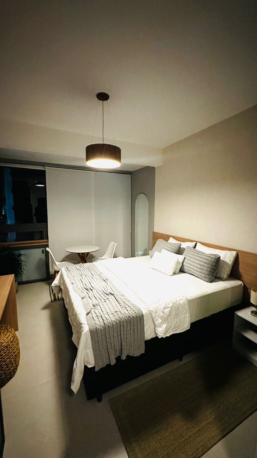 Experience One Eleven in Vila Olimpia. This modern apartment features large windows with breathtaking city views and natural light. The unit boasts 600 Mbps internet and a 4K HD TV. For total comfort, it has a Hot/Cold AC system: 27,000 BTU/h unit in the living room and 10,000 BTU/h in the bedroom. The bedroom is quiet and dark for a restful sleep. Impeccably maintained, you’ll be walking distance to top restaurants and business hubs—a safe, upscale retreat with a stunning urban backdrop.